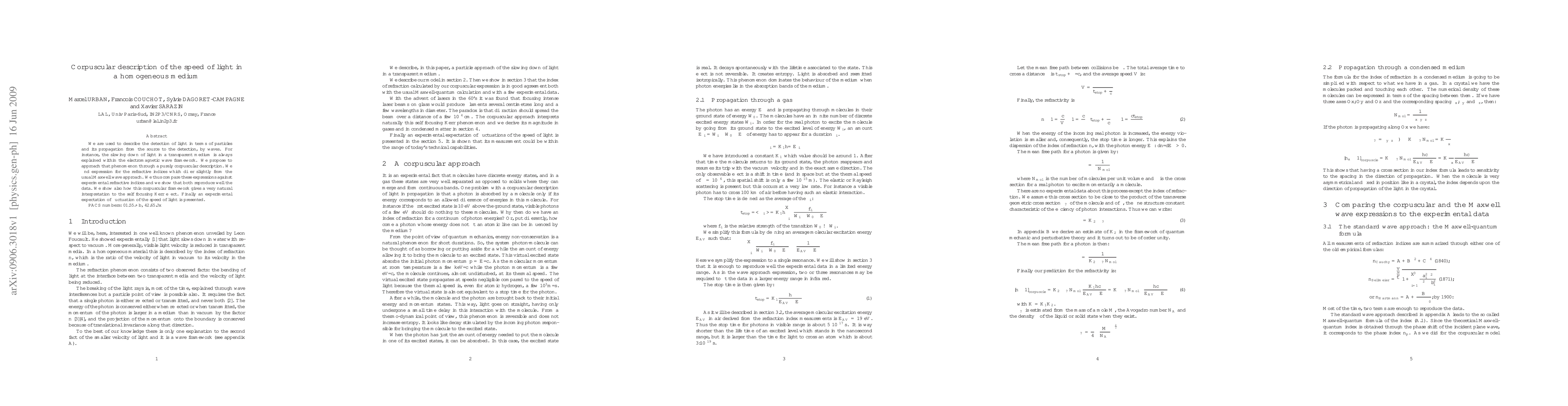 We are used to describe the detection of light in terms of particles and its propagation from the source to the detection, by waves. For instance, the slowing down of light in a transparent medium is always explained within the electromagnetic wave framework. We propose to approach that phenomenon through a purely corpuscular description. We find expression for the refractive indices which differ slightly from the usual Maxwell wave approach. We thus compare these expressions against experimental refractive indices and we show that both reproduce well the data. We show also how this corpuscular framework gives a very natural interpretation to the self focusing Kerr effect. Finally an experimental expectation of fluctuation of the speed of light is presented.