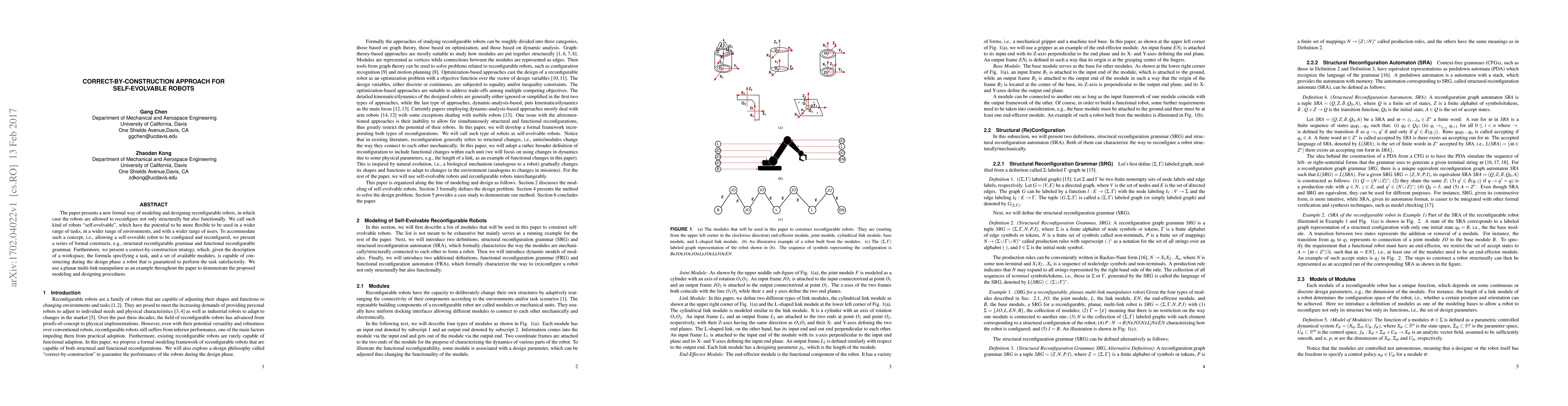 This paper introduces formal constructs for designing self-evolvable robots that can reconfigure both structurally and functionally, employing a correct-by-construction strategy to ensure task performance. The approach uses structural and functional reconfigurable grammars, demonstrated through a planar multi-link manipulator example.