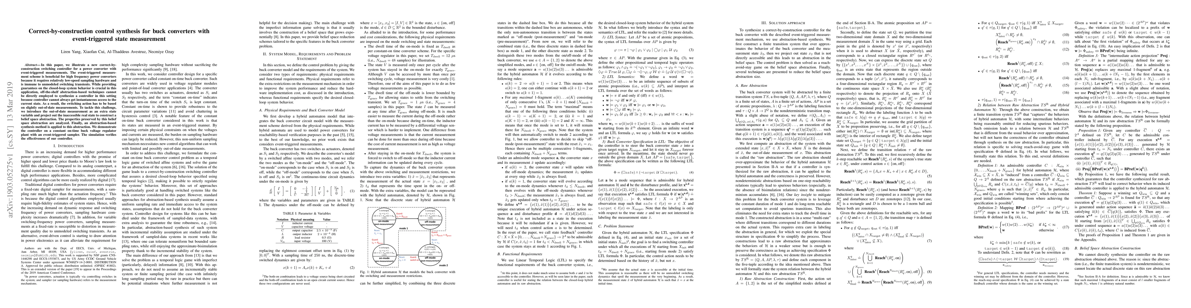 This paper presents a correct-by-construction control synthesis method for buck converters using event-triggered state measurements, addressing the challenge of out-of-date measurements by introducing a belief space abstraction. The proposed controller is verified through simulations on a buck voltage regulator plant.