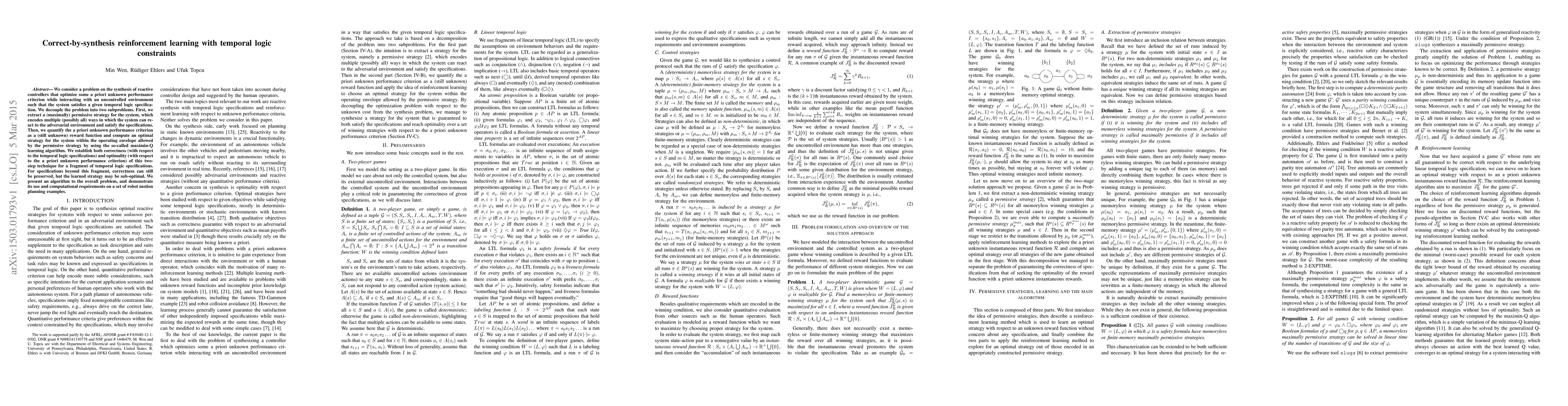 This paper proposes a method for synthesizing reactive controllers that satisfy temporal logic specifications while optimizing an unknown performance criterion using reinforcement learning. The approach involves first extracting a permissive strategy and then applying maximin-Q learning to find an optimal strategy within this envelope, ensuring correctness and optimality for a specific temporal logic fragment.