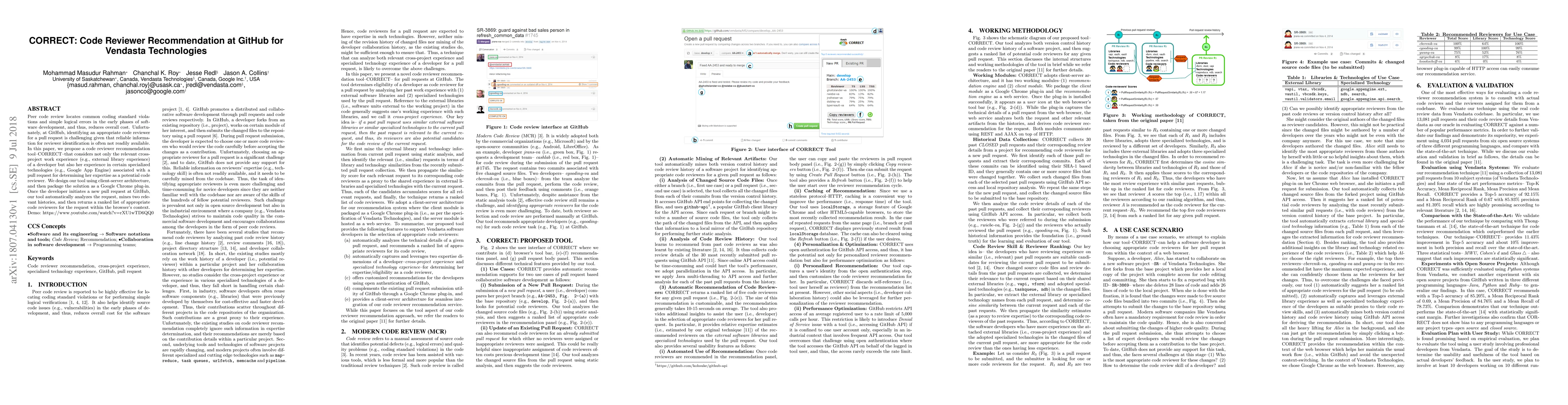 This paper proposes CORRECT, a code reviewer recommendation tool for GitHub that identifies suitable reviewers based on developers' cross-project and specialized technology experience. The tool operates via a Chrome plug-in, analyzing pull requests and providing a ranked list of potential reviewers.