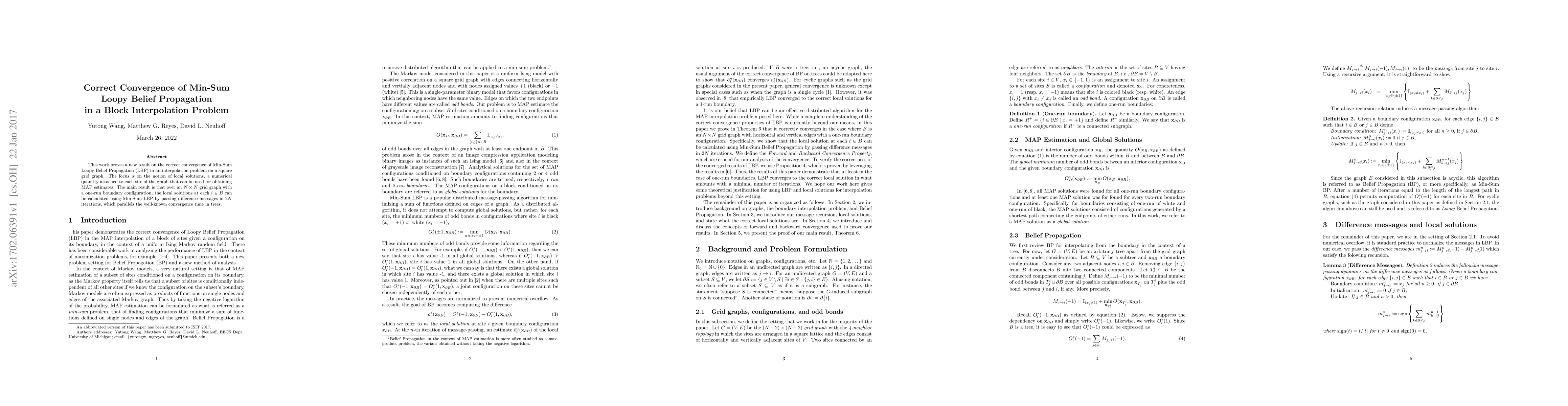 This work proves a new result on the correct convergence of Min-Sum Loopy Belief Propagation (LBP) in an interpolation problem on a square grid graph. The focus is on the notion of local solutions, a numerical quantity attached to each site of the graph that can be used for obtaining MAP estimates. The main result is that over an $N\times N$ grid graph with a one-run boundary configuration, the local solutions at each $i \in B$ can be calculated using Min-Sum LBP by passing difference messages in $2N$ iterations, which parallels the well-known convergence time in trees.