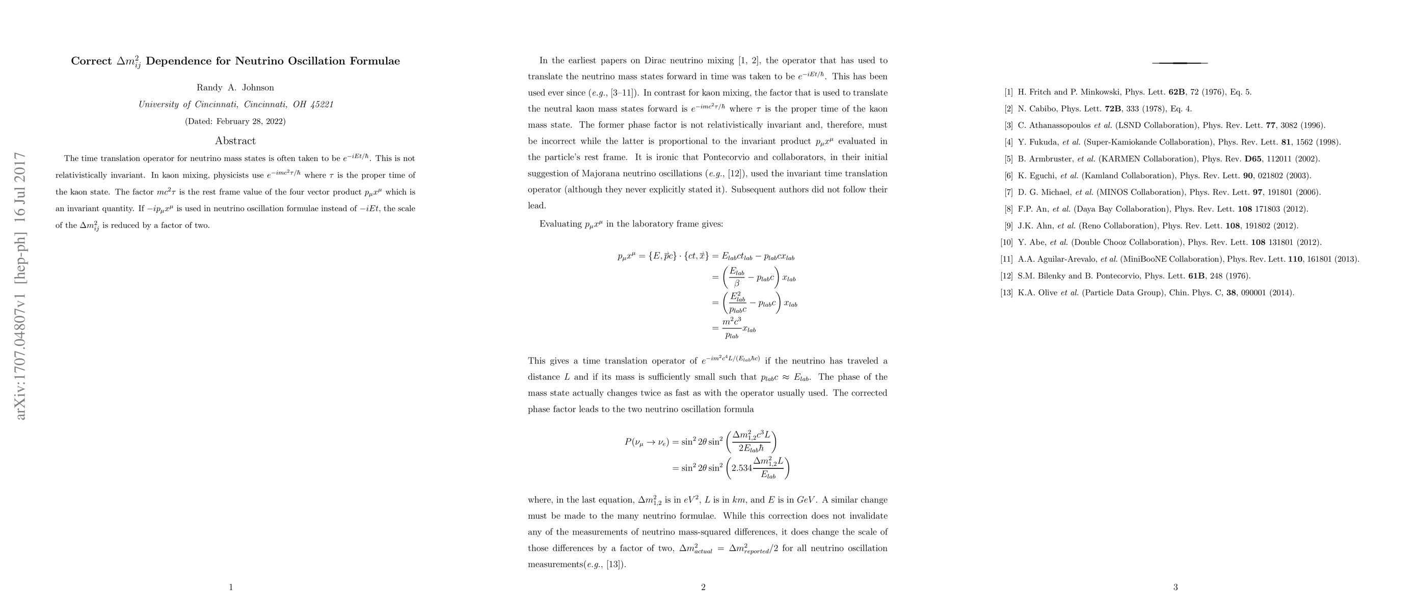The time translation operator for neutrino mass states is often taken to be $e^{-iEt/\hbar}$. This is not relativistically invariant. In kaon mixing, physicists use $e^{-imc^2\tau/\hbar}$ where $\tau$ is the proper time of the kaon state. The factor $mc^2\tau$ is the rest frame value of the four vector product $p_\mu x^\mu$ which is an invariant quantity. If $-i p_\mu x^\mu$ is used in neutrino oscillation formulae instead of $-iEt$, the scale of the $\Delta m^2_{ij}$ is reduced by a factor of two.