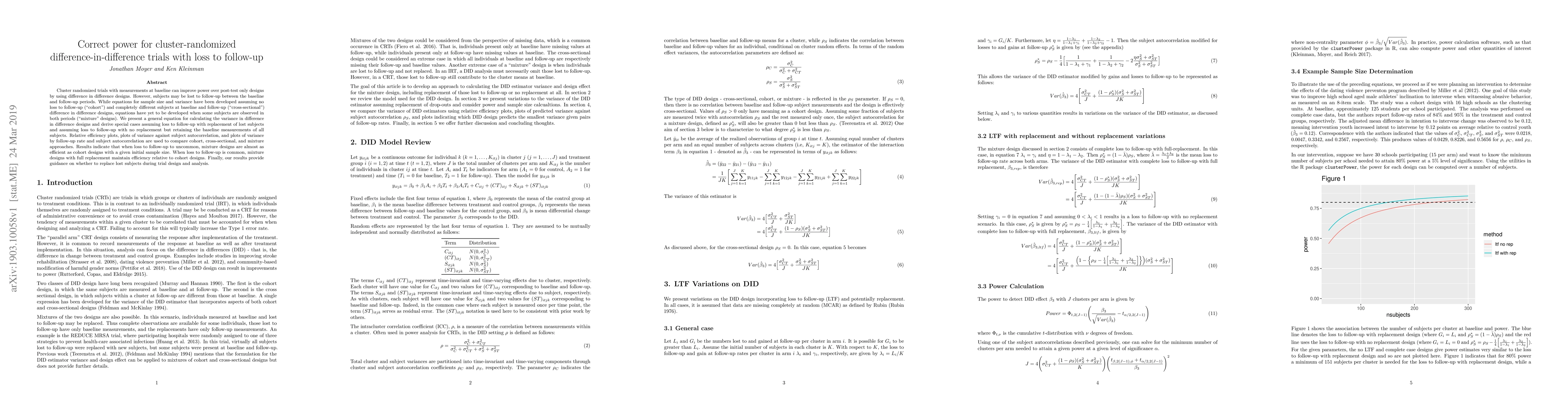 This paper develops a general equation for calculating variance in cluster-randomized difference-in-difference trials with loss to follow-up, comparing cohort, cross-sectional, and mixture designs. It finds that mixture designs are nearly as efficient as cohort designs when follow-up loss is uncommon, and full replacement of lost subjects maintains efficiency when loss is common.