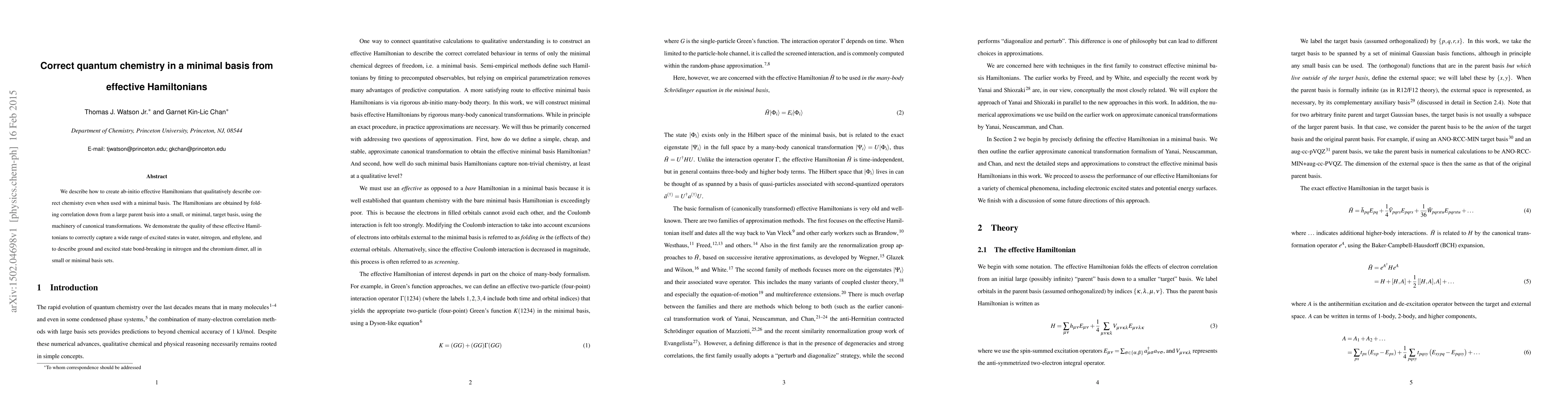 We describe how to create ab-initio effective Hamiltonians that qualitatively describe correct chemistry even when used with a minimal basis. The Hamiltonians are obtained by folding correlation down from a large parent basis into a small, or minimal, target basis, using the machinery of canonical transformations. We demonstrate the quality of these effective Hamiltonians to correctly capture a wide range of excited states in water, nitrogen, and ethylene, and to describe ground and excited state bond-breaking in nitrogen and the chromium dimer, all in small or minimal basis sets.