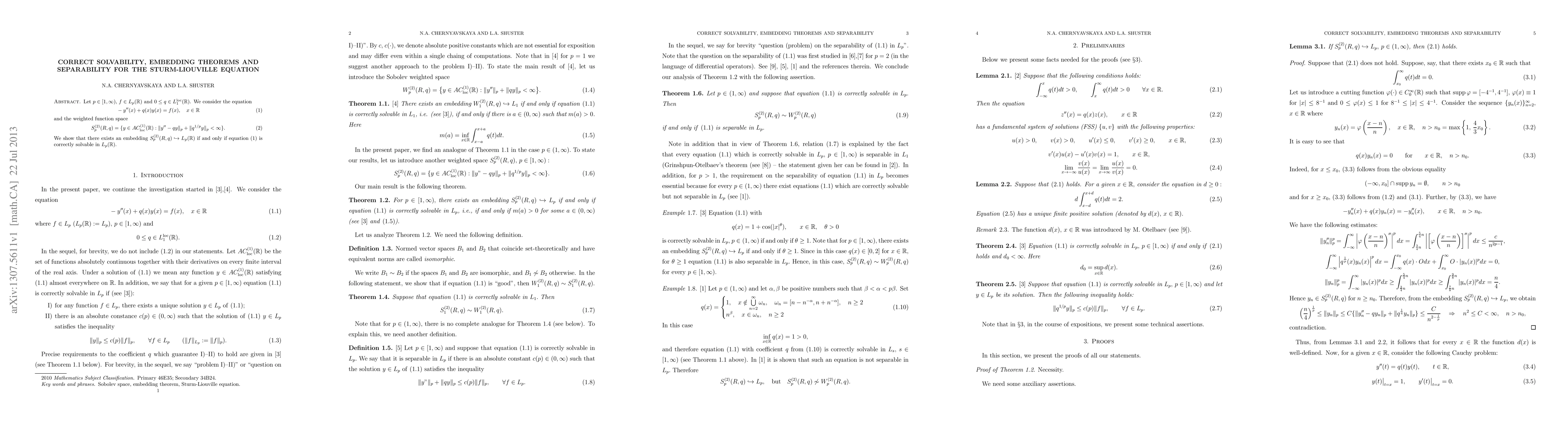 We consider the equation - y"(x)+q(x)y(x)=f(x), x\in R and the weighted function space S_p^{(2)}(R,q)=\{y\in AC_{\loc}^{(1)}(R):\|y"-qy\|_p+\|q^{1/p}y\|_p<\infty\}; p\in[1,\infty), f\in L_p(R)$ and $0\le q\in L_1^{\loc}(R)$. We show that there exists an embedding S_p^{(2)}(R,q)\hookrightarrow L_p(R) if and only if equation above is correctly solvable in $L_p(R).