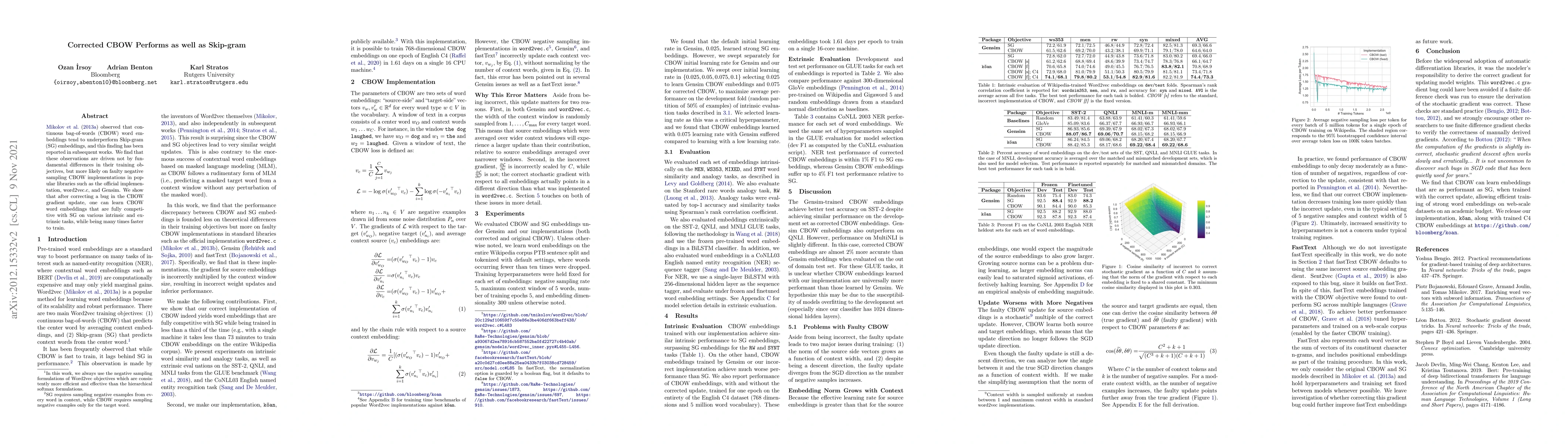 This paper demonstrates that corrected CBOW embeddings can perform as effectively as Skip-gram embeddings, attributing previous underperformance to flawed negative sampling implementations in popular libraries. With a fixed bug, CBOW achieves competitive results on various tasks while training significantly faster.