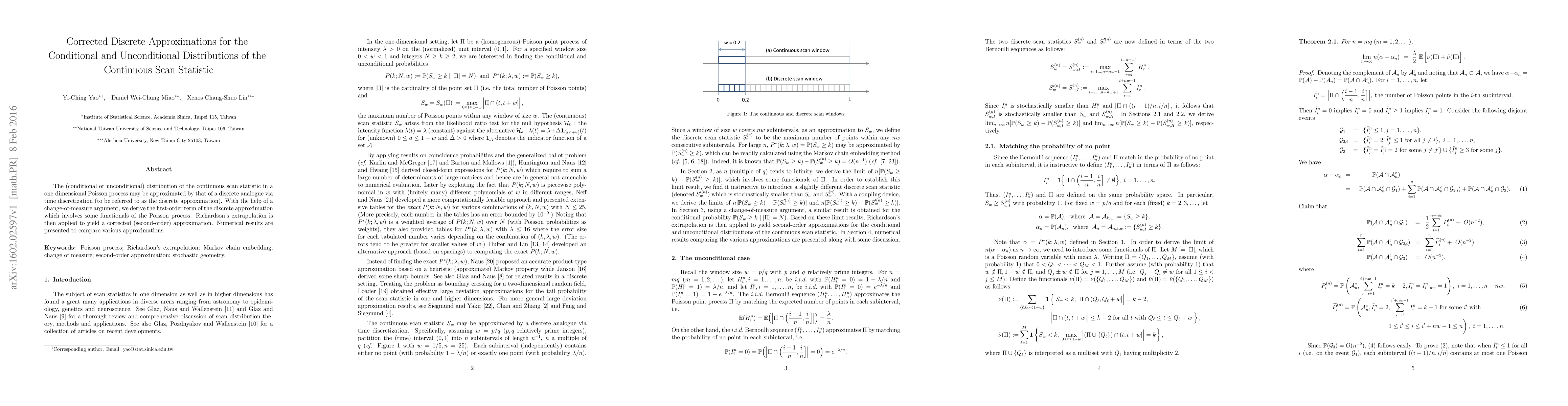 The (conditional or unconditional) distribution of the continuous scan statistic in a one-dimensional Poisson process may be approximated by that of a discrete analogue via time discretization (to be referred to as the discrete approximation). With the help of a change-of-measure argument, we derive the first-order term of the discrete approximation which involves some functionals of the Poisson process. Richardson's extrapolation is then applied to yield a corrected (second-order) approximation. Numerical results are presented to compare various approximations.