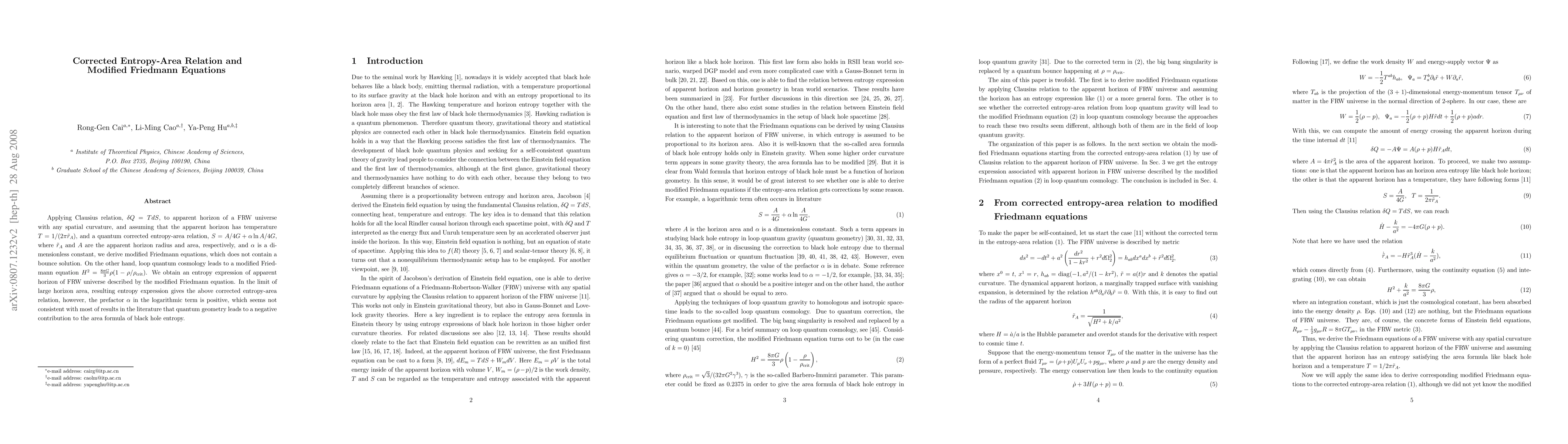 This paper derives modified Friedmann equations from the apparent horizon of a Friedmann-Robertson-Walker universe using a quantum corrected entropy-area relation, resulting in equations without a bounce solution. It also discusses the implications for loop quantum cosmology and highlights a discrepancy in the prefactor of the logarithmic term compared to typical black hole entropy results.