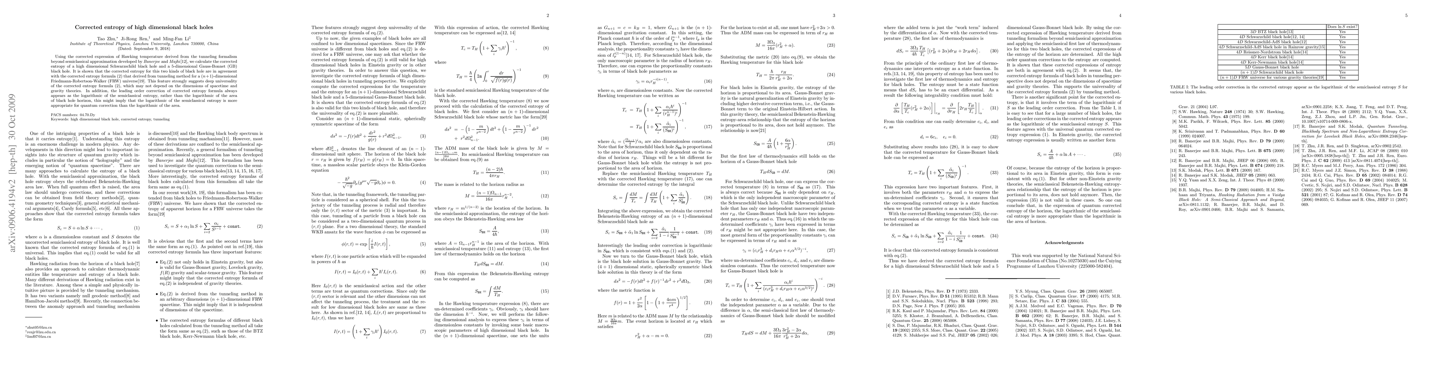 This paper calculates the corrected entropy of high dimensional Schwarzschild and 5-dimensional Gauss-Bonnet black holes using a new Hawking temperature expression from tunneling formalism. The results suggest a universal corrected entropy formula independent of spacetime dimensions and gravity theories, with the leading correction appearing as the logarithmic of the semiclassical entropy.