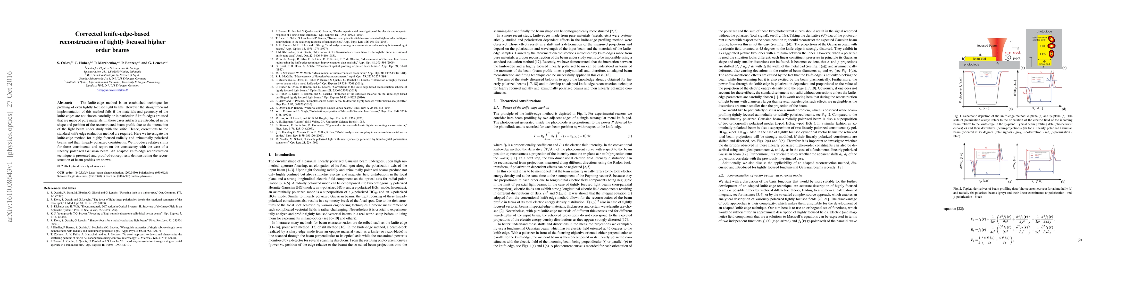 This paper corrects the knife-edge method for profiling tightly focused higher order beams, addressing artifacts caused by improper knife-edge materials and geometry. An adapted technique introduces relative shifts for beam constituents, validated through reconstruction of radially and azimuthally polarized beams, and a linearly polarized Gaussian beam.