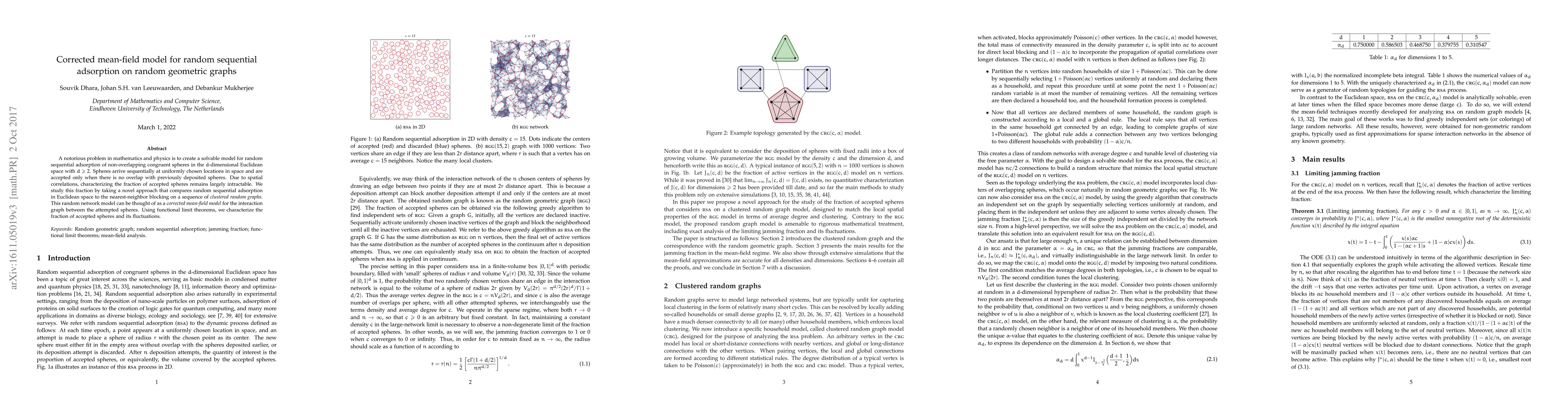 This paper proposes a corrected mean-field model to study random sequential adsorption of spheres in Euclidean space, comparing it to nearest-neighbor blocking on clustered random geometric graphs. The model characterizes the fraction of accepted spheres and their fluctuations using functional limit theorems.