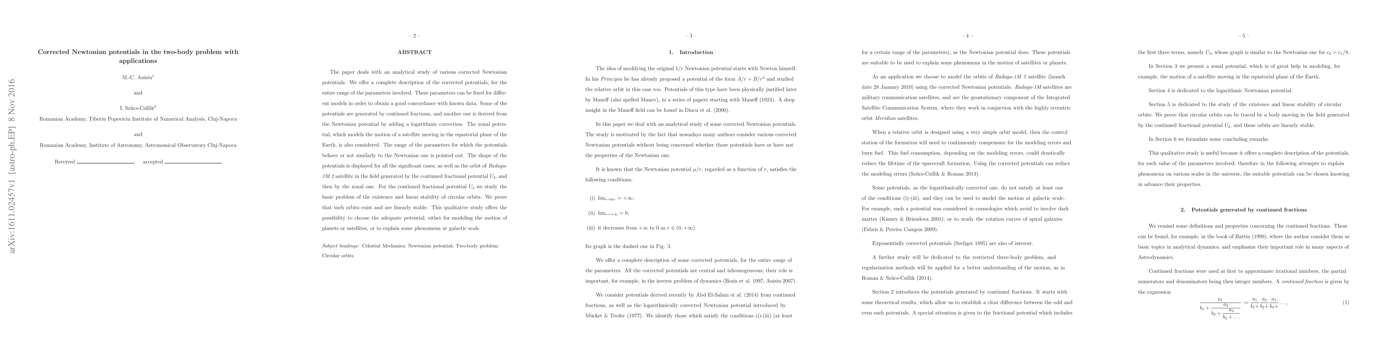 The paper deals with an analytical study of various corrected Newtonian potentials. We offer a complete description of the corrected potentials, for the entire range of the parameters involved. These parameters can be fixed for different models in order to obtain a good concordance with known data. Some of the potentials are generated by continued fractions, and another one is derived from the Newtonian potential by adding a logarithmic correction. The zonal potential, which models the motion of a satellite moving in the equatorial plane of the Earth, is also considered. The range of the parameters for which the potentials behave or not similarly to the Newtonian one is pointed out. The shape of the potentials is displayed for all the significant cases, as well as the orbit of Raduga-1M 2 satellite in the field generated by the continued fractional potential U3, and then by the zonal one. For the continued fractional potential U2 we study the basic problem of the existence and linear stability of circular orbits. We prove that such orbits exist and are linearly stable. This qualitative study offers the possibility to choose the adequate potential, either for modeling the motion of planets or satellites, or to explain some phenomena at galactic scale.
