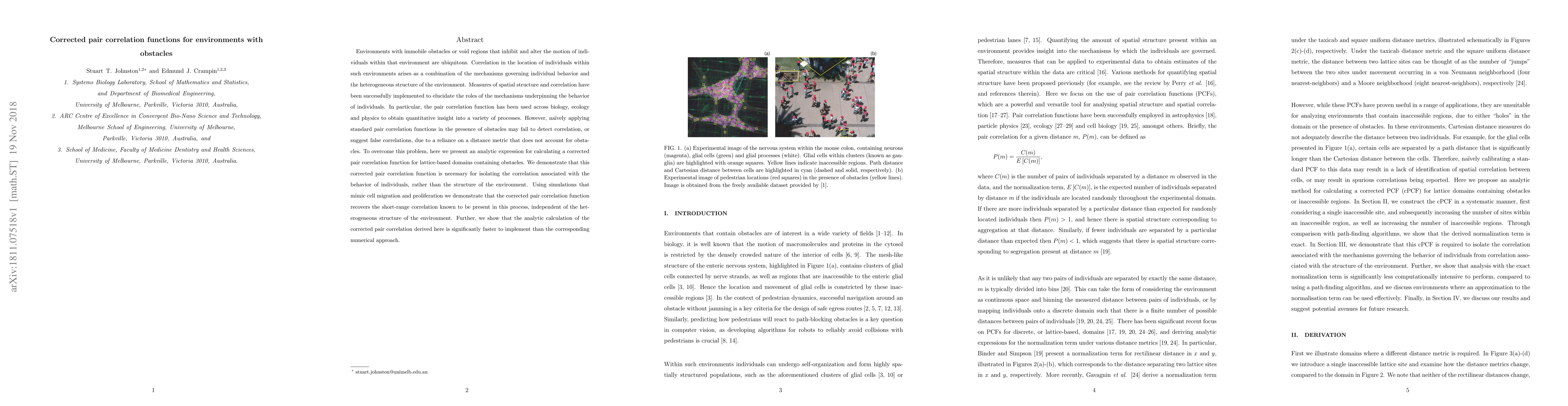 This paper presents an analytic expression for a corrected pair correlation function to accurately measure spatial correlations in environments with obstacles, overcoming limitations of standard methods. The corrected function isolates individual behavior correlations from environmental structure, demonstrated through simulations of cell migration and proliferation.