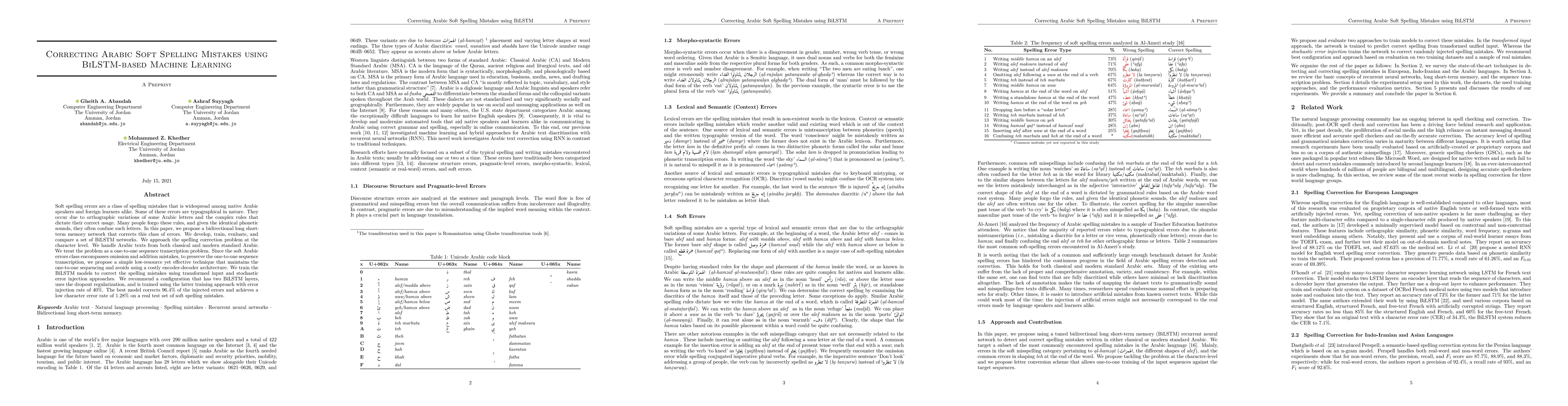 This paper proposes a bidirectional long short-term memory network (BiLSTM) to correct Arabic soft spelling errors, which are common due to orthographic variations and complex rules. The BiLSTM model, trained with error injection and dropout, achieves 96.4% error correction and a 1.28% character error rate on a test set.