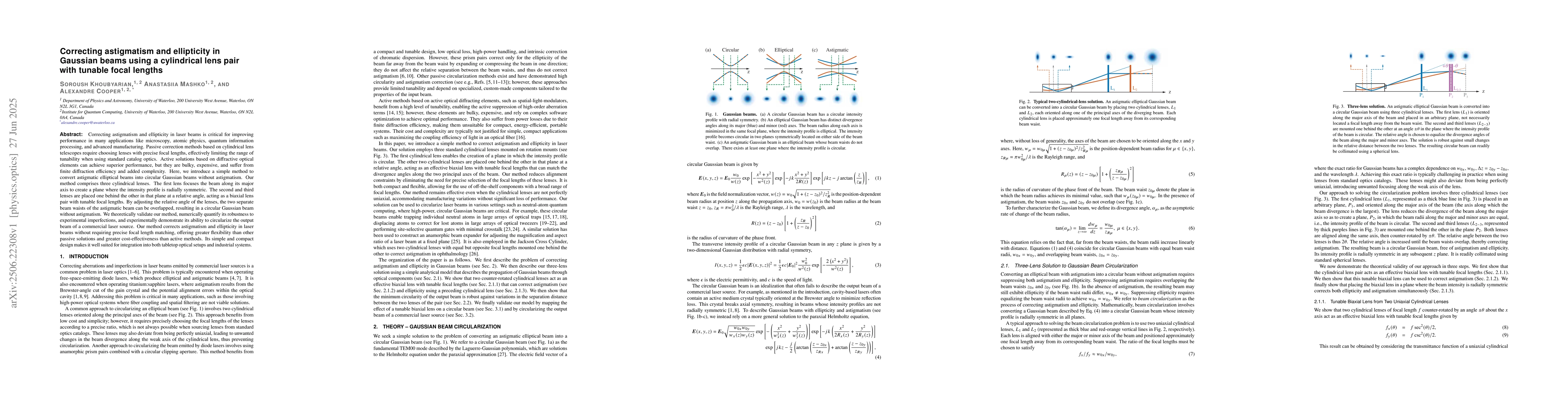 The research introduces a method to correct astigmatism and ellipticity in Gaussian beams using a cylindrical lens pair with tunable focal lengths, validated through theoretical analysis, numerical simulations, and experimental demonstrations.