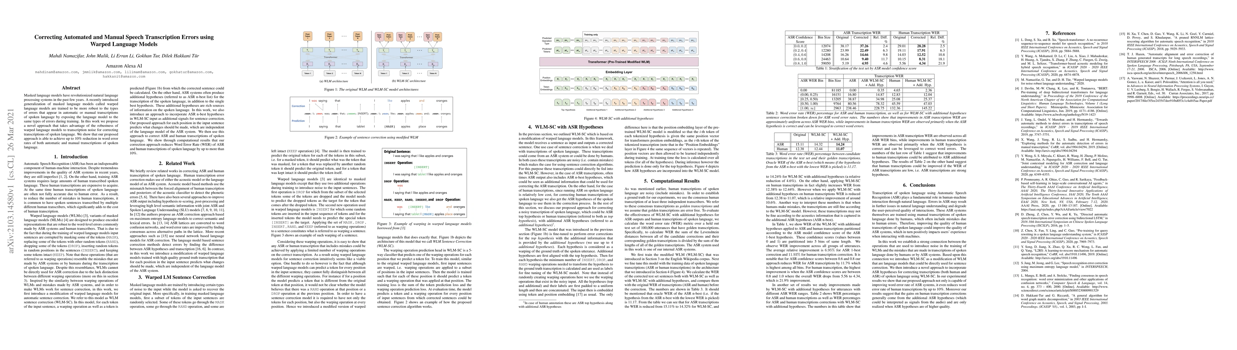 This paper proposes a method leveraging warped language models to correct errors in both automatic and manual speech transcriptions, achieving up to a 10% reduction in word error rates due to the models' robustness to transcription noise.
