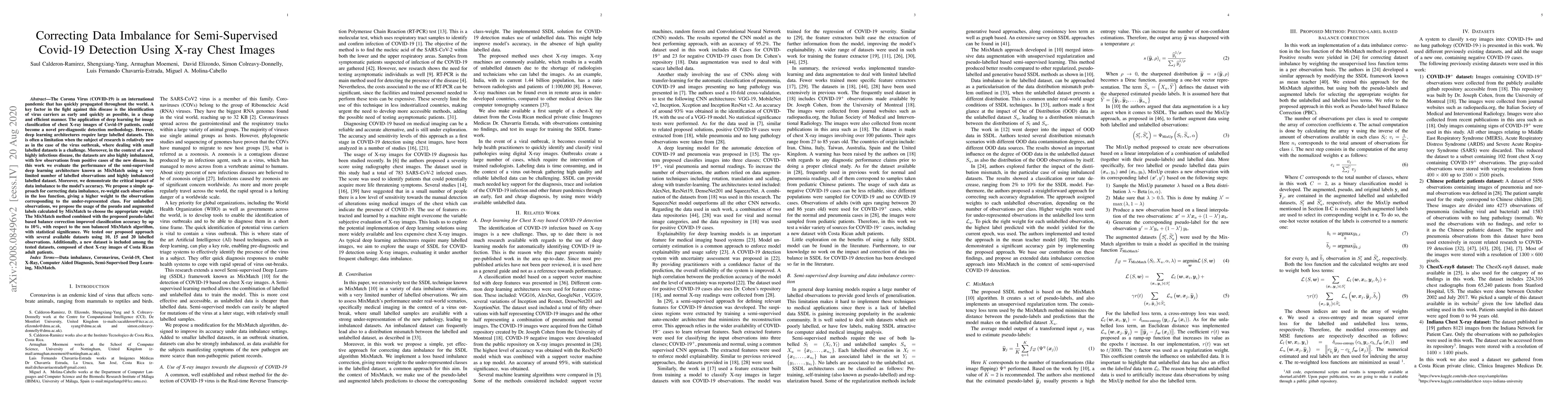 This paper proposes a method to improve semi-supervised deep learning for COVID-19 detection using chest X-ray images by addressing data imbalance. The MixMatch algorithm combined with a re-weighting approach for under-represented classes significantly enhances classification accuracy by up to 10%, tested on various datasets including a new dataset of Costa Rican patients.