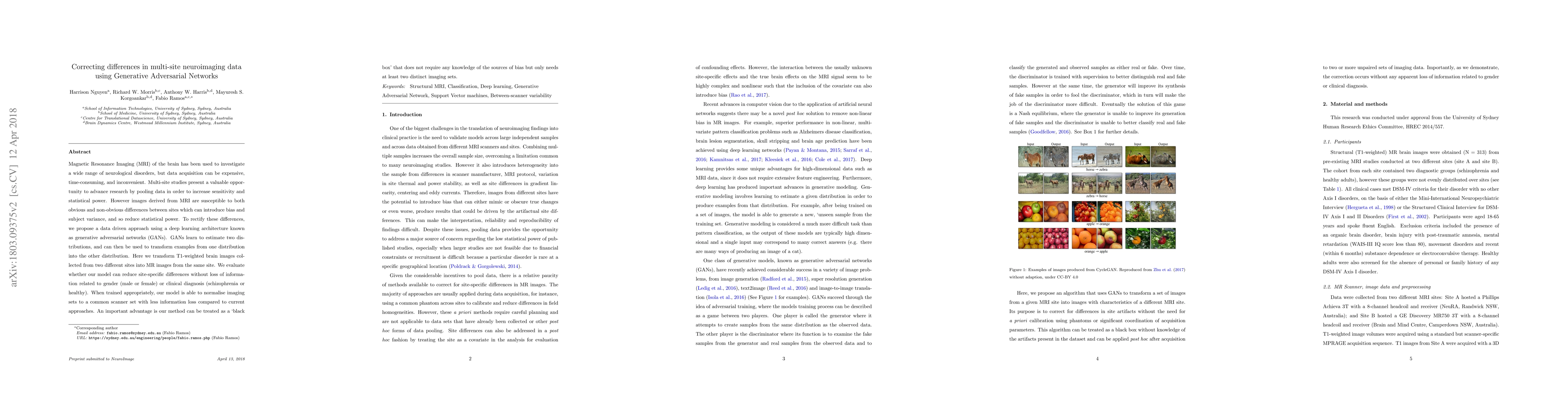 Magnetic Resonance Imaging (MRI) of the brain has been used to investigate a wide range of neurological disorders, but data acquisition can be expensive, time-consuming, and inconvenient. Multi-site studies present a valuable opportunity to advance research by pooling data in order to increase sensitivity and statistical power. However images derived from MRI are susceptible to both obvious and non-obvious differences between sites which can introduce bias and subject variance, and so reduce statistical power. To rectify these differences, we propose a data driven approach using a deep learning architecture known as generative adversarial networks (GANs). GANs learn to estimate two distributions, and can then be used to transform examples from one distribution into the other distribution. Here we transform T1-weighted brain images collected from two different sites into MR images from the same site. We evaluate whether our model can reduce site-specific differences without loss of information related to gender (male, female) or clinical diagnosis (schizophrenia, bipolar disorder, healthy). When trained appropriately, our model is able to normalise imaging sets to a common scanner set with less information loss compared to current approaches. An important advantage is our method can be treated as a black box that does not require any knowledge of the sources of bias but only needs at least two distinct imaging sets.