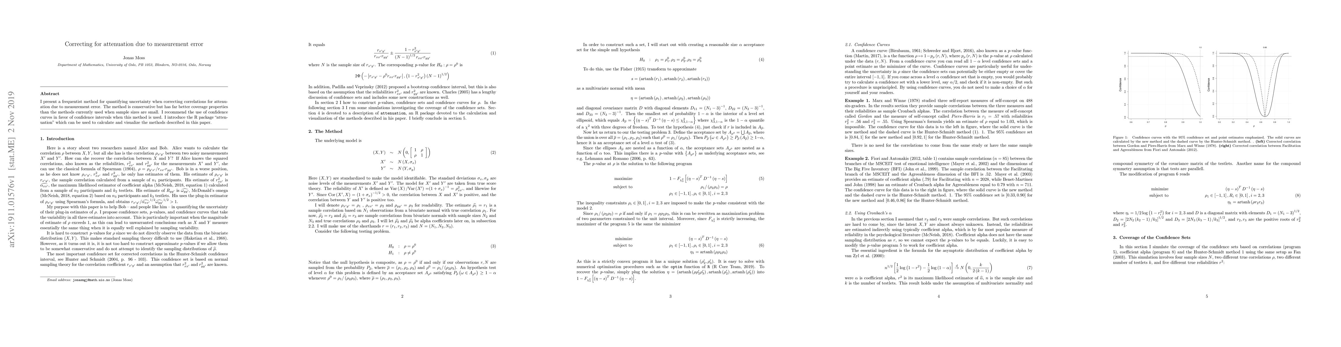 This paper proposes a frequentist method for correcting correlations for measurement error attenuation, which is conservative and performs better with small sample sizes. It recommends confidence curves over intervals and introduces the R package "attenuation" for implementation.