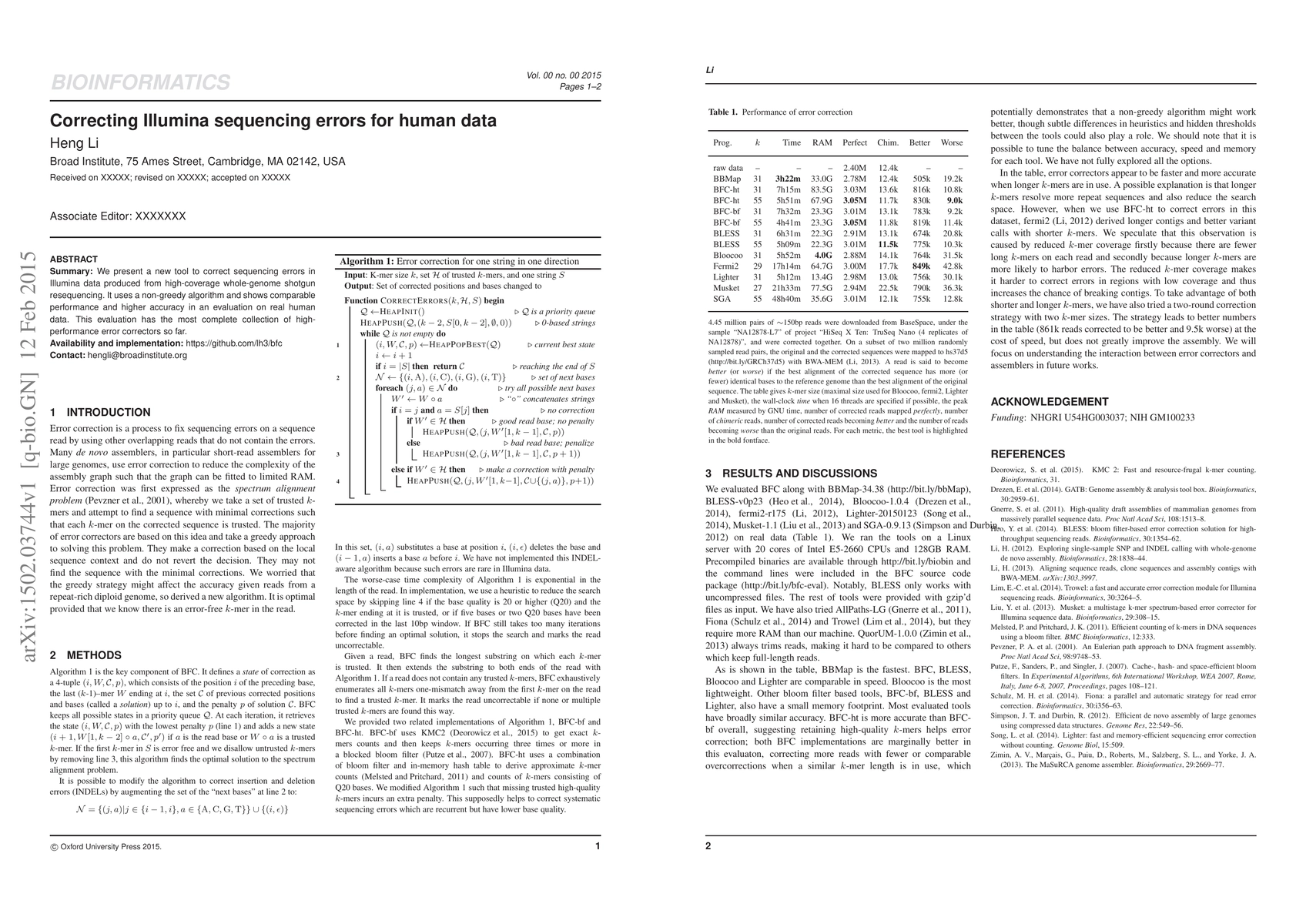 Summary: We present a new tool to correct sequencing errors in Illumina data produced from high-coverage whole-genome shotgun resequencing. It uses a non-greedy algorithm and shows comparable performance and higher accuracy in an evaluation on real human data. This evaluation has the most complete collection of high-performance error correctors so far. Availability and implementation: https://github.com/lh3/bfc Contact: [email protected]