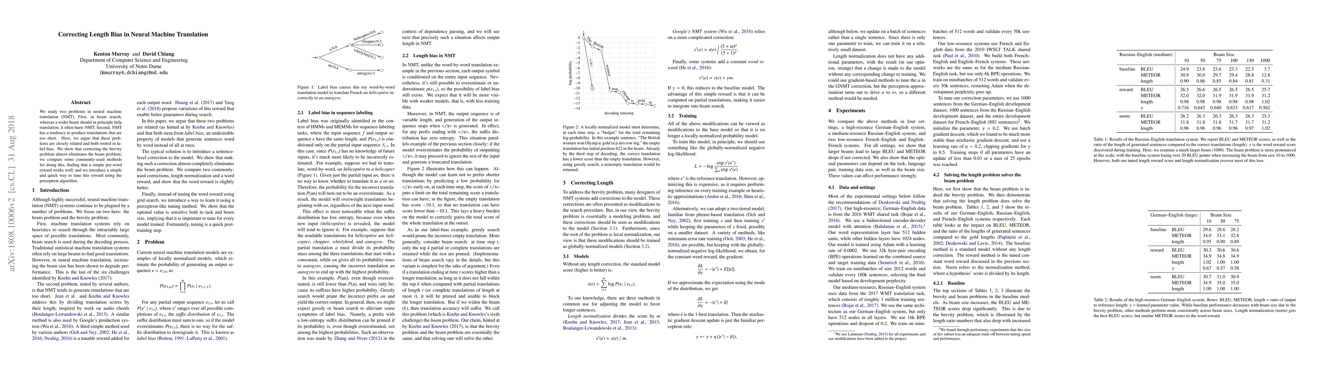 This paper addresses length bias in neural machine translation (NMT), showing that both the beam search issue and the tendency to produce overly short translations stem from label bias. It proposes a simple per-word reward method to correct the brevity problem, which effectively mitigates the beam search issue, and introduces a quick tuning method using the perceptron algorithm.