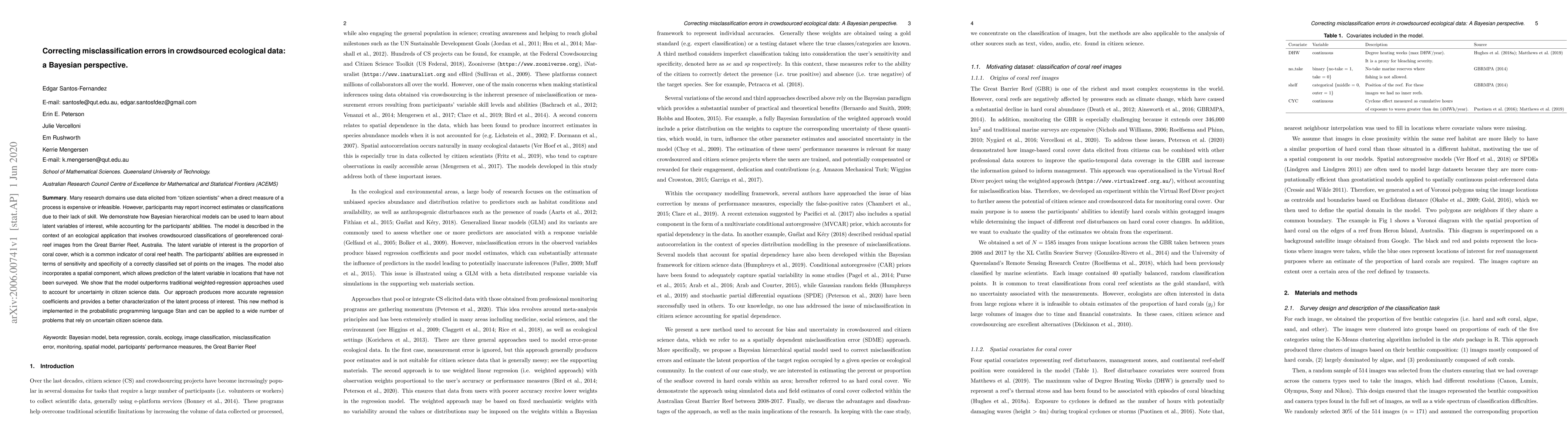 This paper proposes a Bayesian hierarchical model to correct misclassification errors in crowdsourced ecological data, specifically for coral reef health assessments. The model accounts for participants' classification abilities and incorporates spatial components, outperforming traditional regression methods and providing more accurate predictions.