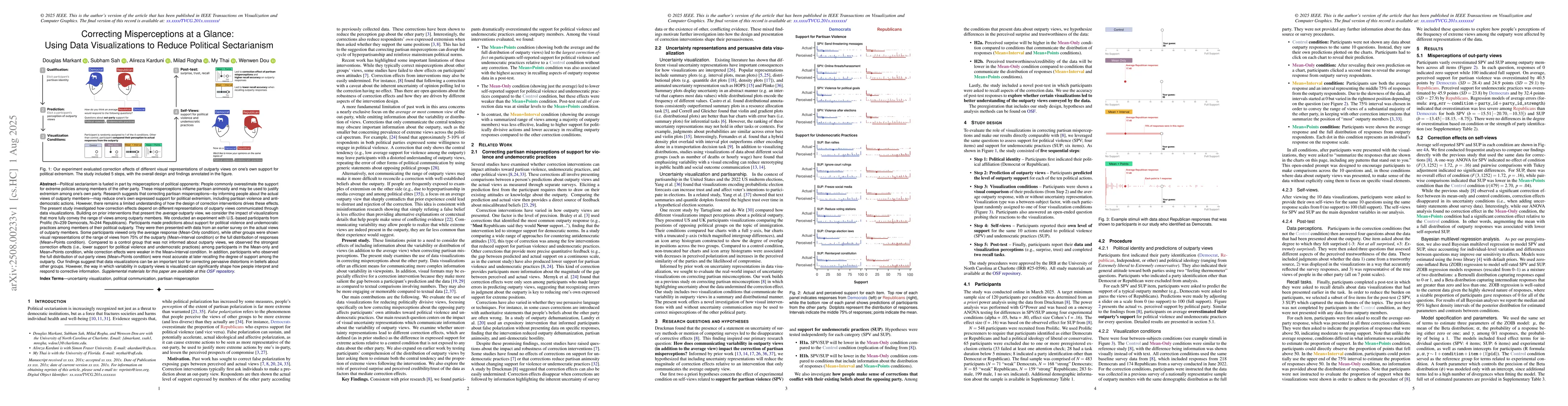 Political sectarianism is fueled in part by misperceptions of political opponents: People commonly overestimate the support for extreme policies among members of the other party. Research suggests that correcting partisan misperceptions by informing people about the actual views of outparty members may reduce one's own expressed support for political extremism, including partisan violence and anti-democratic actions. The present study investigated how correction effects depend on different representations of outparty views communicated through data visualizations. We conducted an experiment with U.S. based participants from Prolific (N=239 Democrats, N=244 Republicans). Participants made predictions about support for political violence and undemocratic practices among members of their political outparty. They were then presented with data from an earlier survey on the actual views of outparty members. Some participants viewed only the average response (Mean-Only condition), while other groups were shown visual representations of the range of views from 75% of the outparty (Mean+Interval condition) or the full distribution of responses (Mean+Points condition). Compared to a control group that was not informed about outparty views, we observed the strongest correction effects among participants in the Mean-only and Mean+Points condition, while correction effects were weaker in the Mean+Interval condition. In addition, participants who observed the full distribution of out-party views (Mean+Points condition) were most accurate at later recalling the degree of support among the outparty. Our findings suggest that data visualizations can be an important tool for correcting pervasive distortions in beliefs about other groups. However, the way in which variability in outparty views is visualized can significantly shape how people interpret and respond to corrective information.