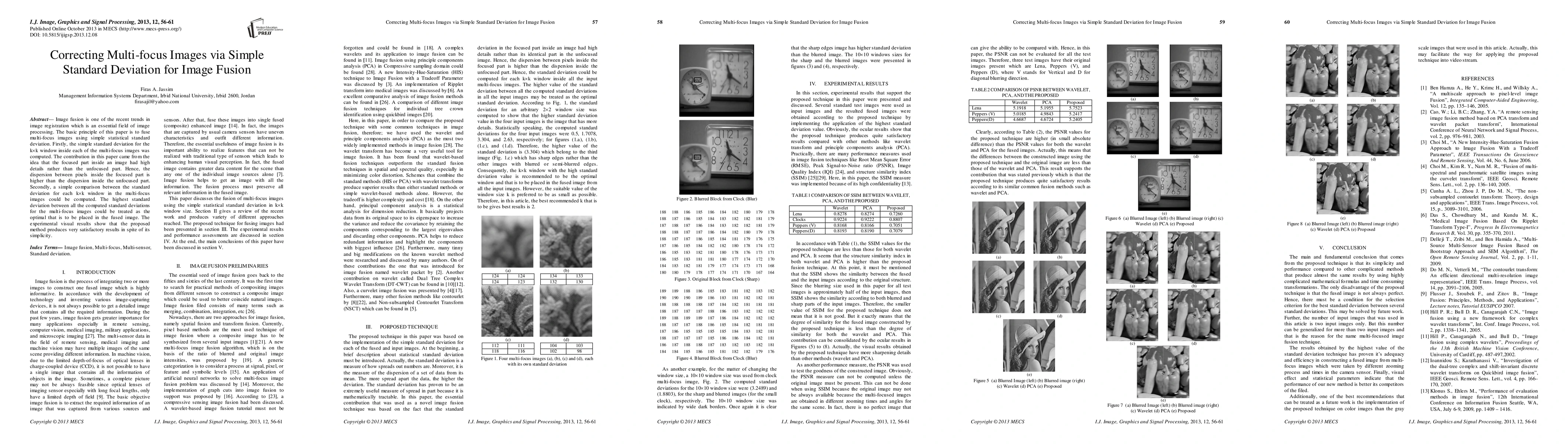 Image fusion is one of the recent trends in image registration which is an essential field of image processing. The basic principle of this paper is to fuse multi-focus images using simple statistical standard deviation. Firstly, the simple standard deviation for the k-by-k window inside each of the multi-focus images was computed. The contribution in this paper came from the idea that the focused part inside an image had high details rather than the unfocused part. Hence, the dispersion between pixels inside the focused part is higher than the dispersion inside the unfocused part. Secondly, a simple comparison between the standard deviation for each k-by-k window in the multi-focus images could be computed. The highest standard deviation between all the computed standard deviations for the multi-focus images could be treated as the optimal that is to be placed in the fused image. The experimental visual results show that the proposed method produces very satisfactory results in spite of its simplicity.