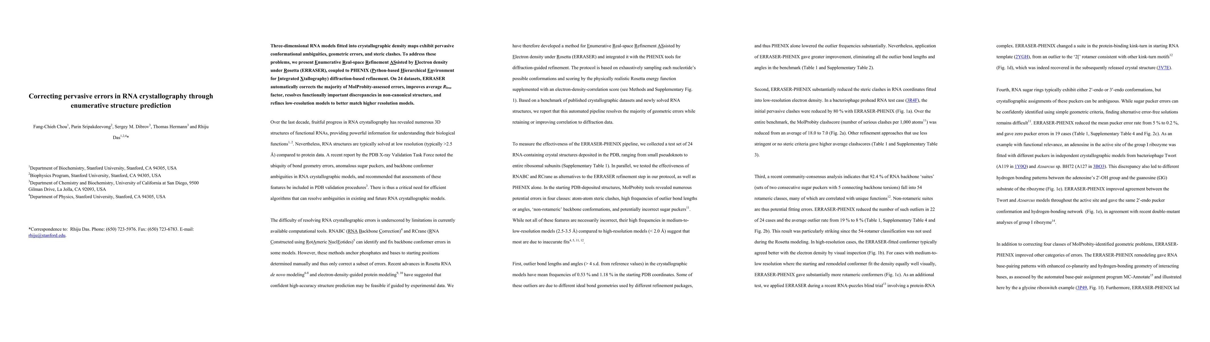 This paper introduces ERRASER, a method combining enumerative real-space refinement and PHENIX refinement, to correct pervasive errors in RNA crystallography, significantly improving model accuracy and resolving structural discrepancies across 24 datasets.
