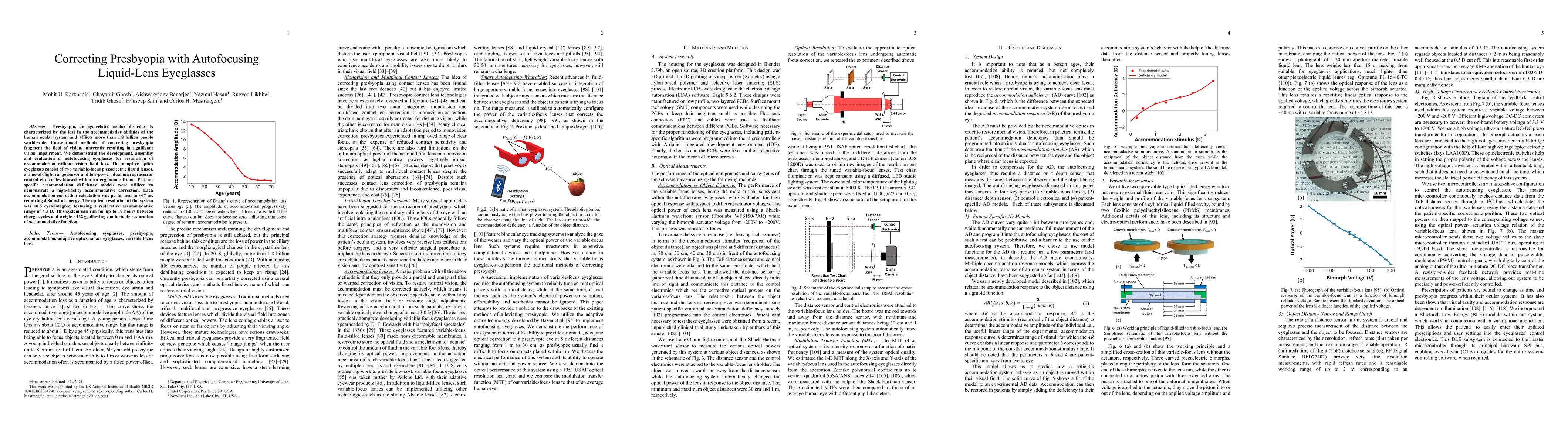 Presbyopia, an age-related ocular disorder, is characterized by the loss in the accommodative abilities of the human ocular system and afflicts more than 1.8 billion people world-wide. Conventional methods of correcting presbyopia fragment the field of vision, inherently resulting in significant vision impairment. We demonstrate the development, assembly and evaluation of autofocusing eyeglasses for restoration of accommodation without vision field loss. The adaptive optics eyeglasses consist of two variable-focus piezoelectric liquid lenses, a time-of-flight range sensor and low-power, dual microprocessor control electronics housed within an ergonomic frame. Patient-specific accommodation deficiency models were utilized to demonstrate a high-fidelity accommodative correction. Each accommodation correction calculation was performed in ~67 ms requiring 4.86 mJ of energy. The optical resolution of the system was 10.5 cycles/degree, featuring a restorative accommodative range of 4.3 D. This system can run for up to 19 hours between charge cycles and weighs ~132 g, allowing comfortable restoration of accommodative function