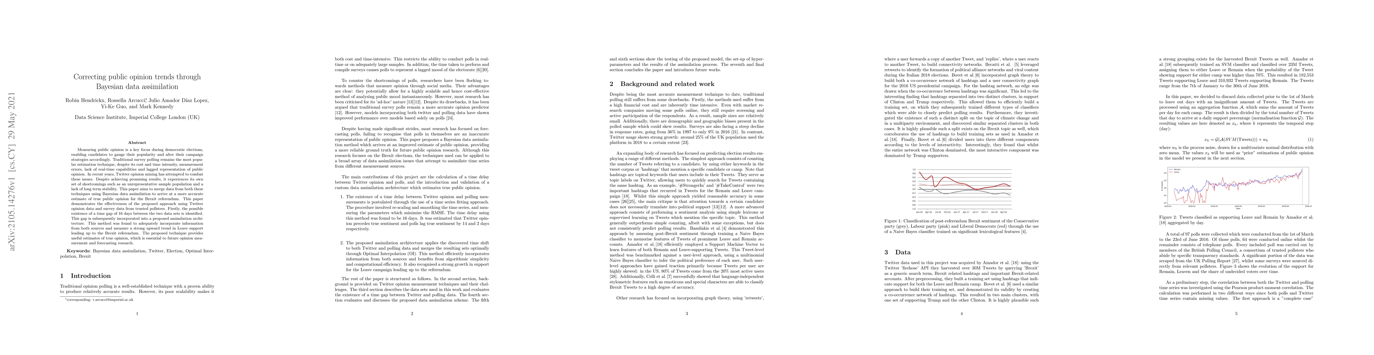 Measuring public opinion is a key focus during democratic elections, enabling candidates to gauge their popularity and alter their campaign strategies accordingly. Traditional survey polling remains the most popular estimation technique, despite its cost and time intensity, measurement errors, lack of real-time capabilities and lagged representation of public opinion. In recent years, Twitter opinion mining has attempted to combat these issues. Despite achieving promising results, it experiences its own set of shortcomings such as an unrepresentative sample population and a lack of long term stability. This paper aims to merge data from both these techniques using Bayesian data assimilation to arrive at a more accurate estimate of true public opinion for the Brexit referendum. This paper demonstrates the effectiveness of the proposed approach using Twitter opinion data and survey data from trusted pollsters. Firstly, the possible existence of a time gap of 16 days between the two data sets is identified. This gap is subsequently incorporated into a proposed assimilation architecture. This method was found to adequately incorporate information from both sources and measure a strong upward trend in Leave support leading up to the Brexit referendum. The proposed technique provides useful estimates of true opinion, which is essential to future opinion measurement and forecasting research.