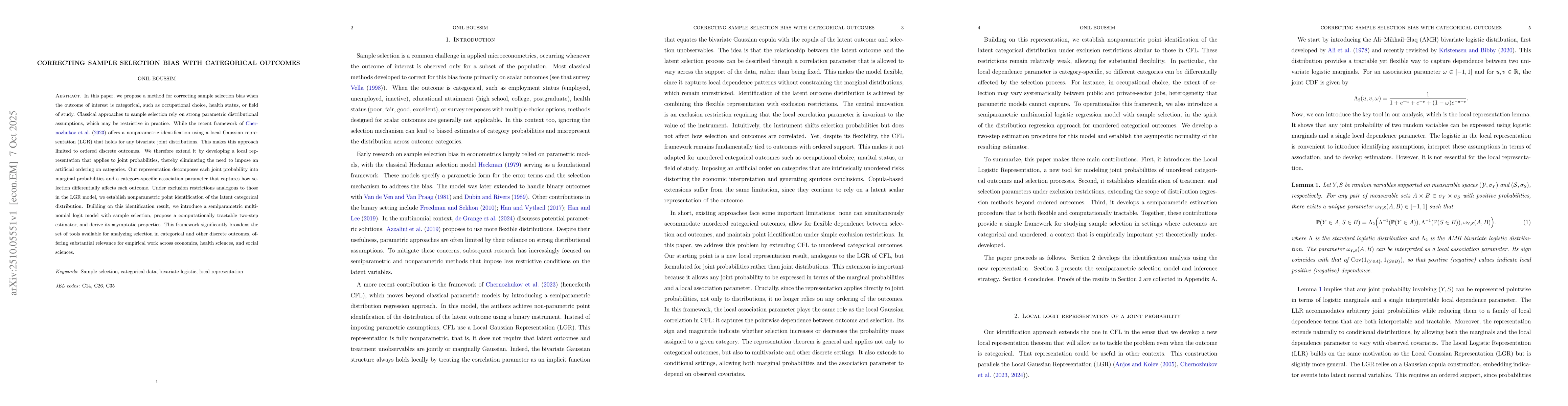 In this paper, we propose a method for correcting sample selection bias when the outcome of interest is categorical, such as occupational choice, health status, or field of study. Classical approaches to sample selection rely on strong parametric distributional assumptions, which may be restrictive in practice. While the recent framework of Chernozhukov et al. (2023) offers a nonparametric identification using a local Gaussian representation (LGR) that holds for any bivariate joint distributions. This makes this approach limited to ordered discrete outcomes. We therefore extend it by developing a local representation that applies to joint probabilities, thereby eliminating the need to impose an artificial ordering on categories. Our representation decomposes each joint probability into marginal probabilities and a category-specific association parameter that captures how selection differentially affects each outcome. Under exclusion restrictions analogous to those in the LGR model, we establish nonparametric point identification of the latent categorical distribution. Building on this identification result, we introduce a semiparametric multinomial logit model with sample selection, propose a computationally tractable two-step estimator, and derive its asymptotic properties. This framework significantly broadens the set of tools available for analyzing selection in categorical and other discrete outcomes, offering substantial relevance for empirical work across economics, health sciences, and social sciences.
