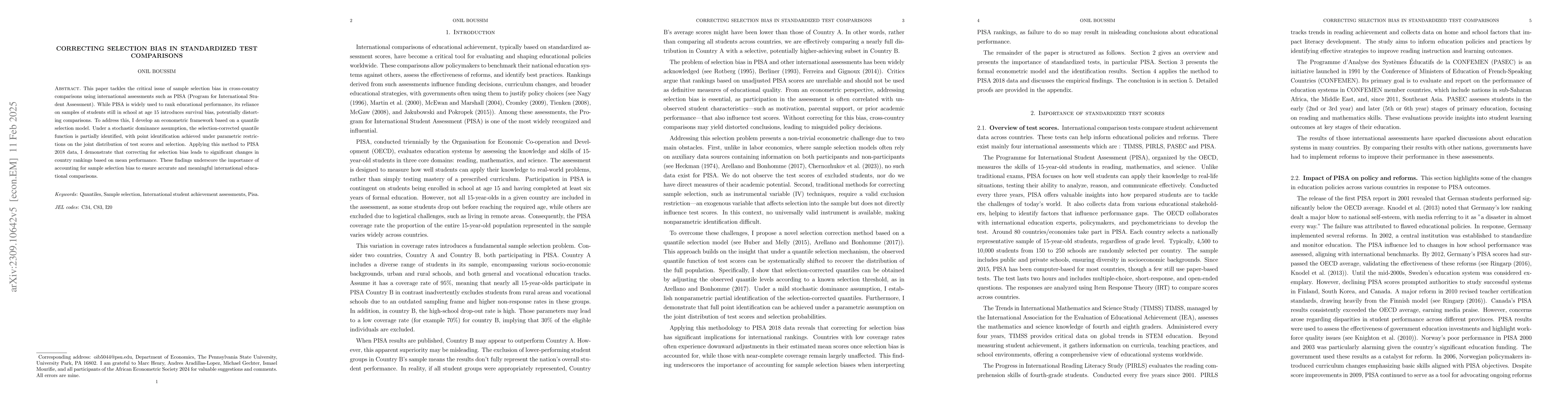 The paper proposes a methodology to correct for sample selection bias in international educational comparisons using a quantile selection model. It applies this method to PISA 2018 data.