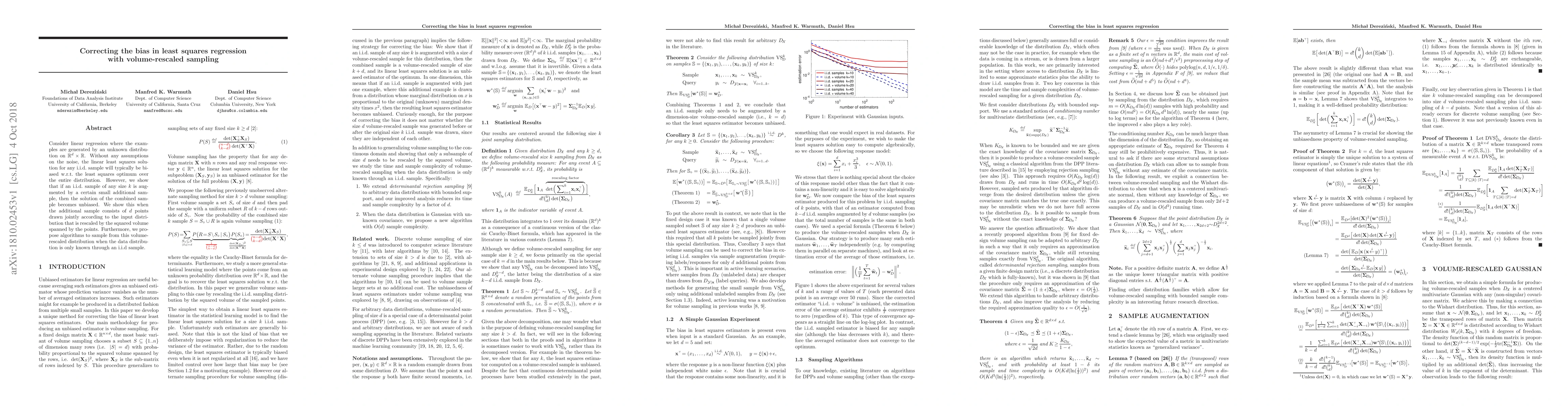 Consider linear regression where the examples are generated by an unknown distribution on $R^d\times R$. Without any assumptions on the noise, the linear least squares solution for any i.i.d. sample will typically be biased w.r.t. the least squares optimum over the entire distribution. However, we show that if an i.i.d. sample of any size k is augmented by a certain small additional sample, then the solution of the combined sample becomes unbiased. We show this when the additional sample consists of d points drawn jointly according to the input distribution that is rescaled by the squared volume spanned by the points. Furthermore, we propose algorithms to sample from this volume-rescaled distribution when the data distribution is only known through an i.i.d sample.