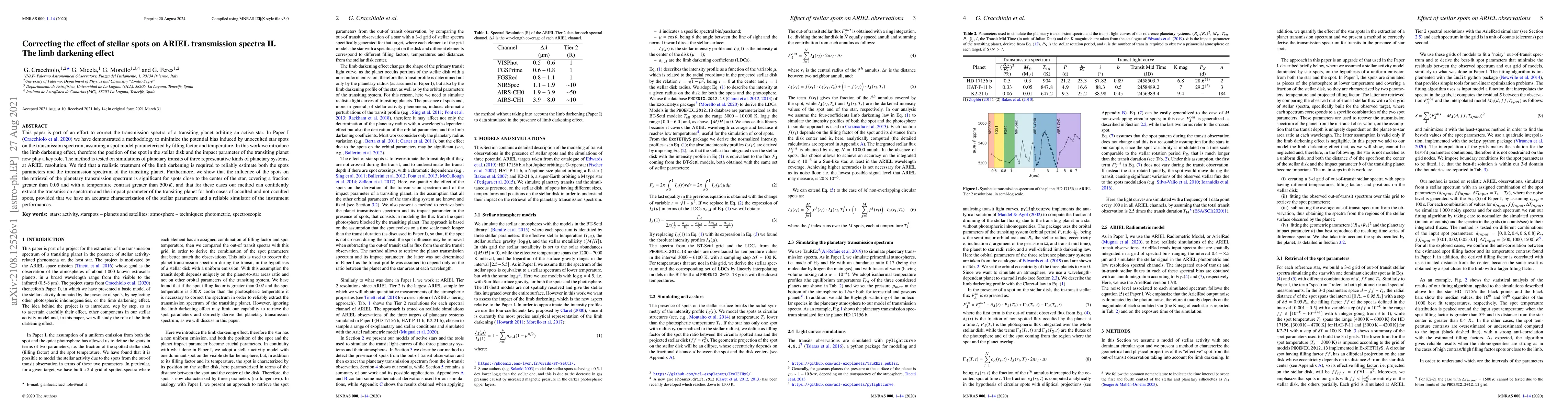 This paper is part of an effort to correct the transmission spectra of a transiting planet orbiting an active star. In Paper I (Cracchiolo et al. 2020) we have demonstrated a methodology to minimize the potential bias induced by unocculted star spots on the transmission spectrum, assuming a spot model parameterized by filling factor and temperature. In this work we introduce the limb darkening effect, therefore the position of the spot in the stellar disk and the impact parameter of the transiting planet now play a key role. The method is tested on simulations of planetary transits of three representative kinds of planetary systems, at ARIEL resolution. We find that a realistic treatment of the limb darkening is required to reliably estimate both the spots parameters and the transmission spectrum of the transiting planet. Furthermore, we show that the influence of the spots onthe retrieval of the planetary transmission spectrum is significant for spots close to the center of the star, covering a fraction greater than 0.05 and with a temperature contrast greater than 500 K, and that for these cases our method can confidently extract the transmission spectrum and the impact parameter of the transiting planet for both cases of occulted and not occulted spots, provided that we have an accurate characterization of the stellar parameters and a reliable simulator of the instrument performances.