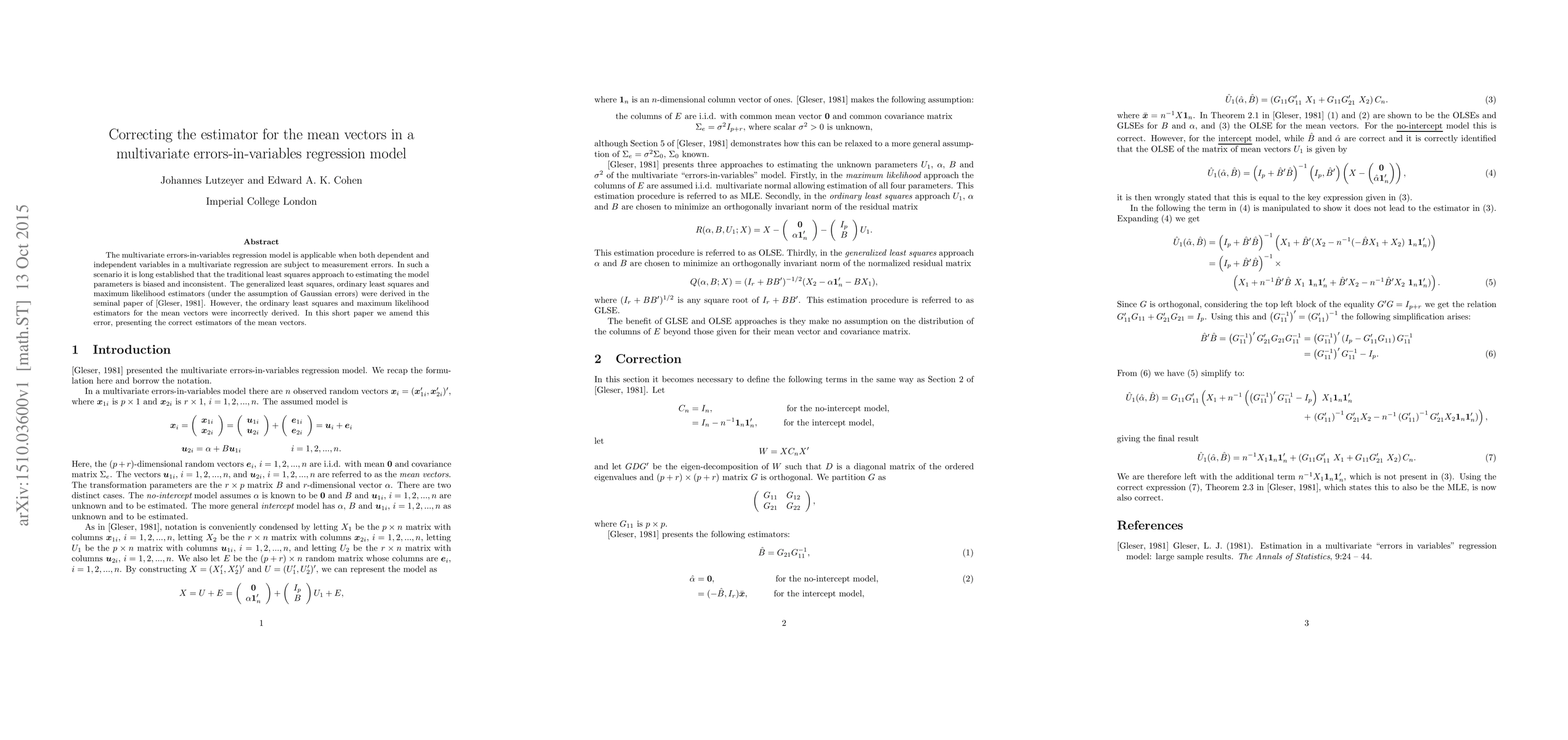 The multivariate errors-in-variables regression model is applicable when both dependent and independent variables in a multivariate regression are subject to measurement errors. In such a scenario it is long established that the traditional least squares approach to estimating the model parameters is biased and inconsistent. The generalized least squares, ordinary least squares and maximum likelihood estimators (under the assumption of Gaussian errors) were derived in the seminal paper of Gleser (1981). However, the ordinary least squares and maximum likelihood estimators for the mean vectors were incorrectly derived. In this short paper we amend this error, presenting the correct estimators of the mean vectors.