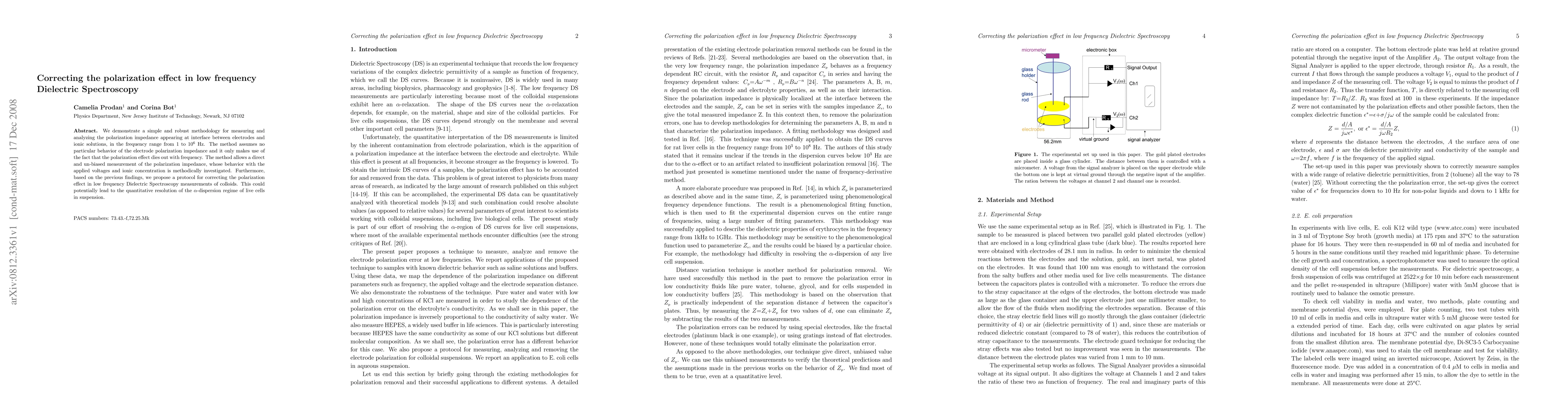 We demonstrate a simple and robust methodology for measuring and analyzing the polarization impedance appearing at interface between electrodes and ionic solutions, in the frequency range from 1 to $10^6$ Hz. The method assumes no particular behavior of the electrode polarization impedance and it only makes use of the fact that the polarization effect dies out with frequency. The method allows a direct and un-biased measurement of the polarization impedance, whose behavior with the applied voltages and ionic concentration is methodically investigated. Furthermore, based on the previous findings, we propose a protocol for correcting the polarization effect in low frequency Dielectric Spectroscopy measurements of colloids. This could potentially lead to the quantitative resolution of the $\alpha$-dispersion regime of live cells in suspension.
