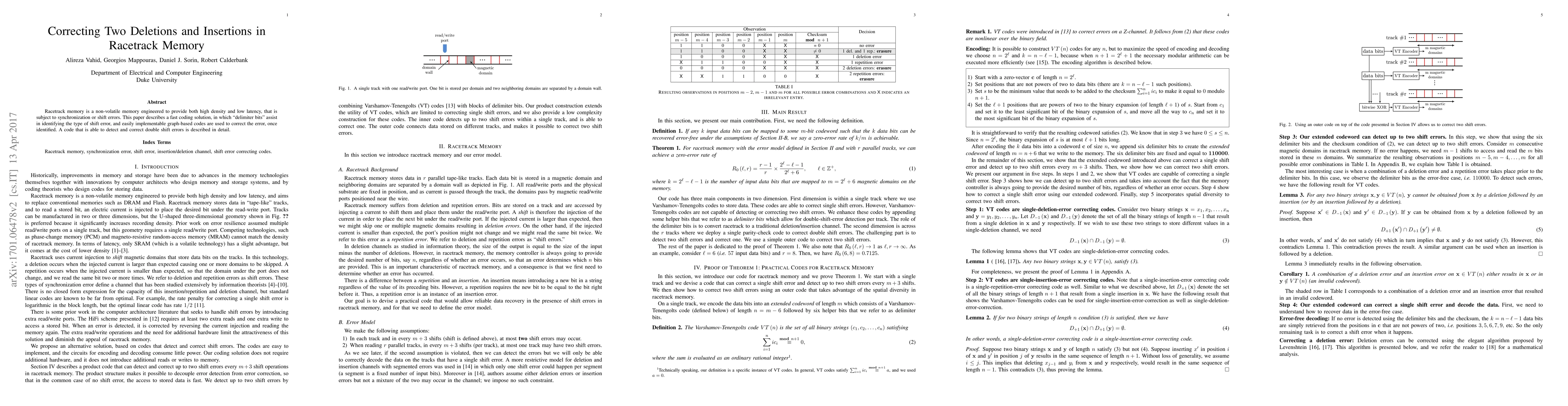 This paper proposes a fast coding solution for racetrack memory to correct two deletions and insertions, using delimiter bits to identify shift errors and graph-based codes for error correction. It details a code capable of detecting and correcting double shift errors.