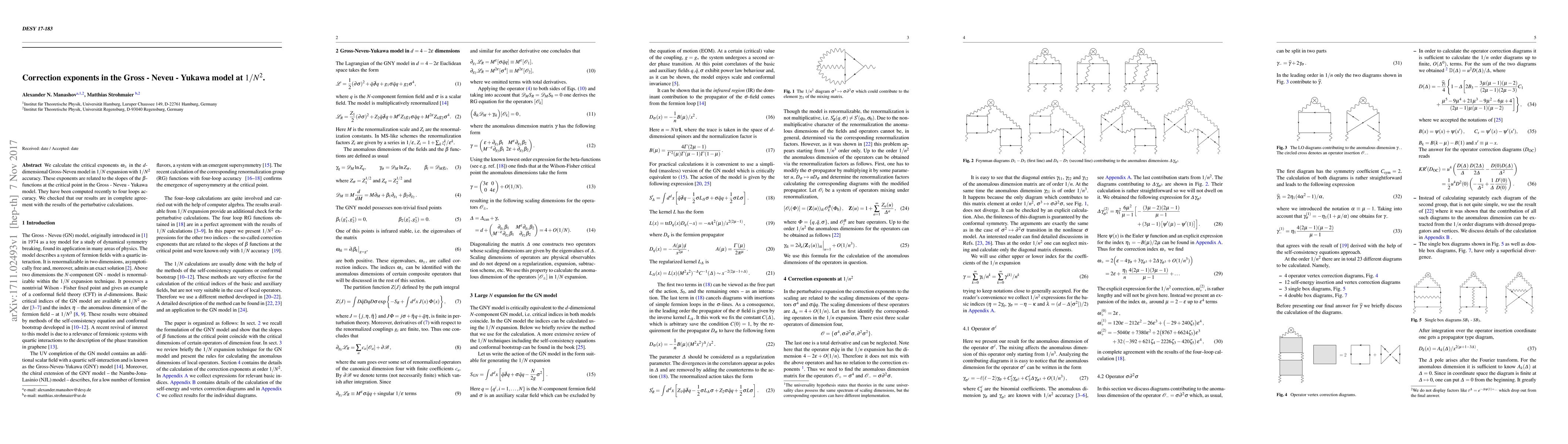 The paper calculates critical exponents $\omega_\pm$ in the $d$-dimensional Gross-Neveu model to $1/N^2$ accuracy using $1/N$ expansion, verifying agreement with four-loop perturbative calculations. These exponents determine the slopes of $\beta$-functions at the critical point in the Gross-Neveu-Yukawa model.