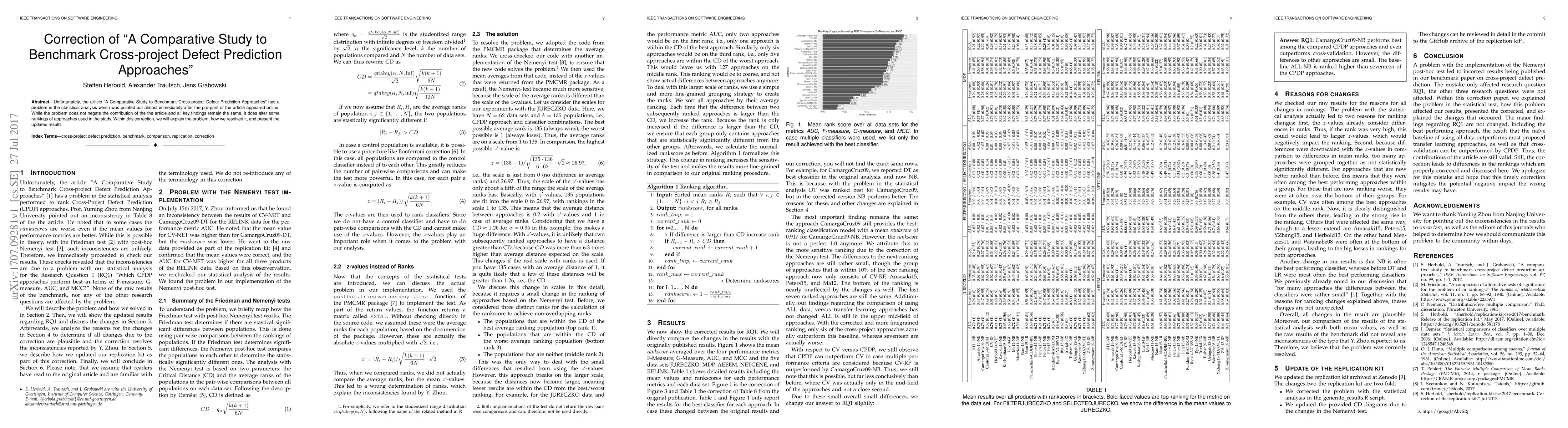 Unfortunately, the article "A Comparative Study to Benchmark Cross-project Defect Prediction Approaches" has a problem in the statistical analysis which was pointed out almost immediately after the pre-print of the article appeared online. While the problem does not negate the contribution of the the article and all key findings remain the same, it does alter some rankings of approaches used in the study. Within this correction, we will explain the problem, how we resolved it, and present the updated results.