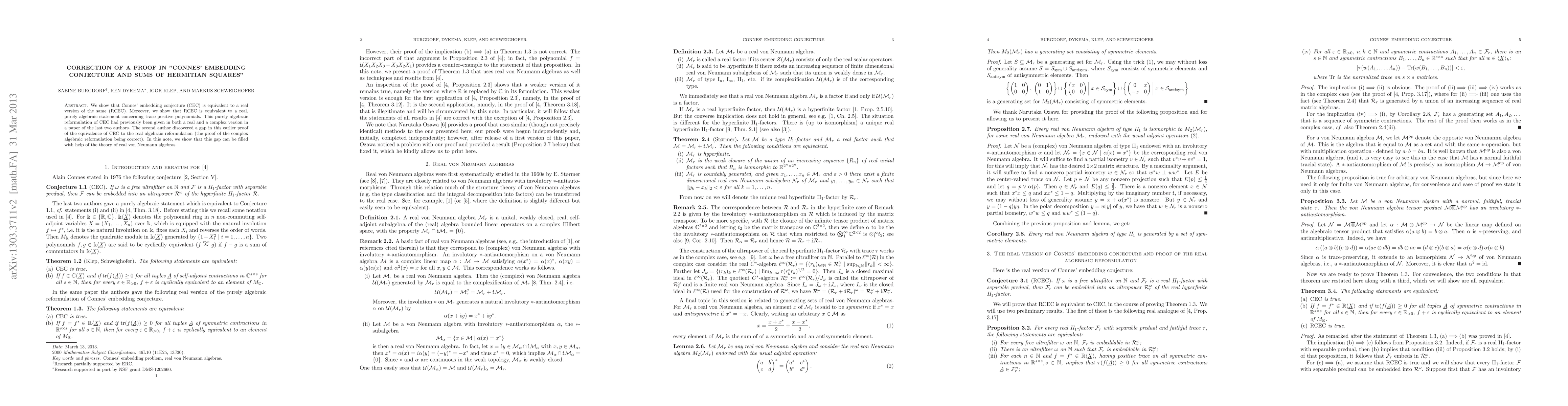 We show that Connes' embedding conjecture (CEC) is equivalent to a real version of the same (RCEC). Moreover, we show that RCEC is equivalent to a real, purely algebraic statement concerning trace positive polynomials. This purely algebraic reformulation of CEC had previously been given in both a real and a complex version in a paper of the last two authors. The second author discovered a gap in this earlier proof of the equivalence of CEC to the real algebraic reformulation (the proof of the complex algebraic reformulation being correct). In this note, we show that this gap can be filled with help of the theory of real von Neumann algebras.
