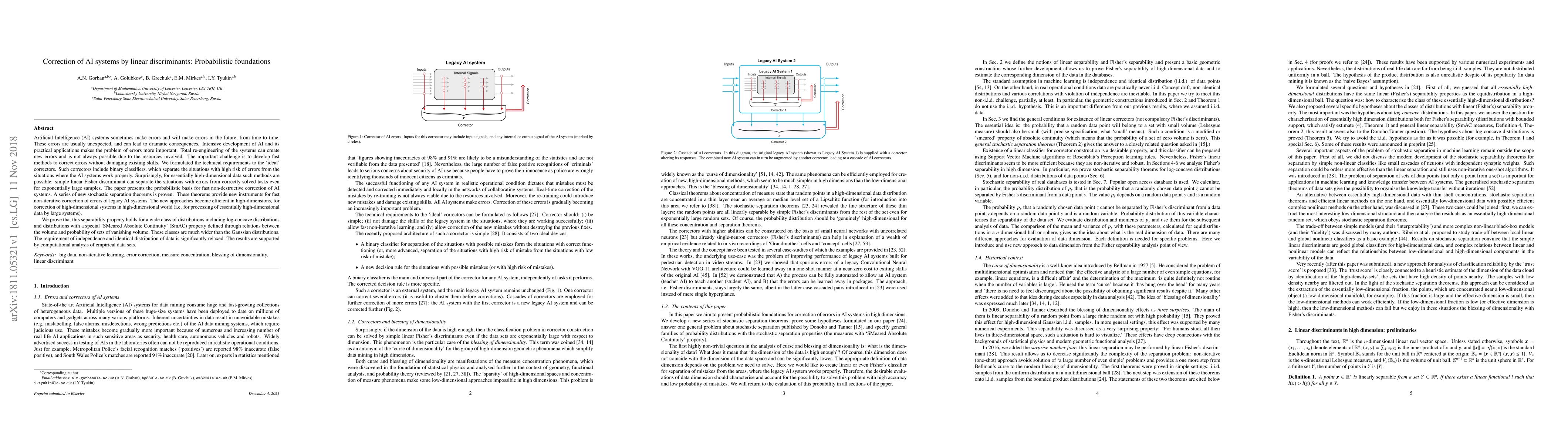 Artificial Intelligence (AI) systems sometimes make errors and will make errors in the future, from time to time. These errors are usually unexpected, and can lead to dramatic consequences. Intensive development of AI and its practical applications makes the problem of errors more important. Total re-engineering of the systems can create new errors and is not always possible due to the resources involved. The important challenge is to develop fast methods to correct errors without damaging existing skills. We formulated the technical requirements to the 'ideal' correctors. Such correctors include binary classifiers, which separate the situations with high risk of errors from the situations where the AI systems work properly. Surprisingly, for essentially high-dimensional data such methods are possible: simple linear Fisher discriminant can separate the situations with errors from correctly solved tasks even for exponentially large samples. The paper presents the probabilistic basis for fast non-destructive correction of AI systems. A series of new stochastic separation theorems is proven. These theorems provide new instruments for fast non-iterative correction of errors of legacy AI systems. The new approaches become efficient in high-dimensions, for correction of high-dimensional systems in high-dimensional world (i.e. for processing of essentially high-dimensional data by large systems).