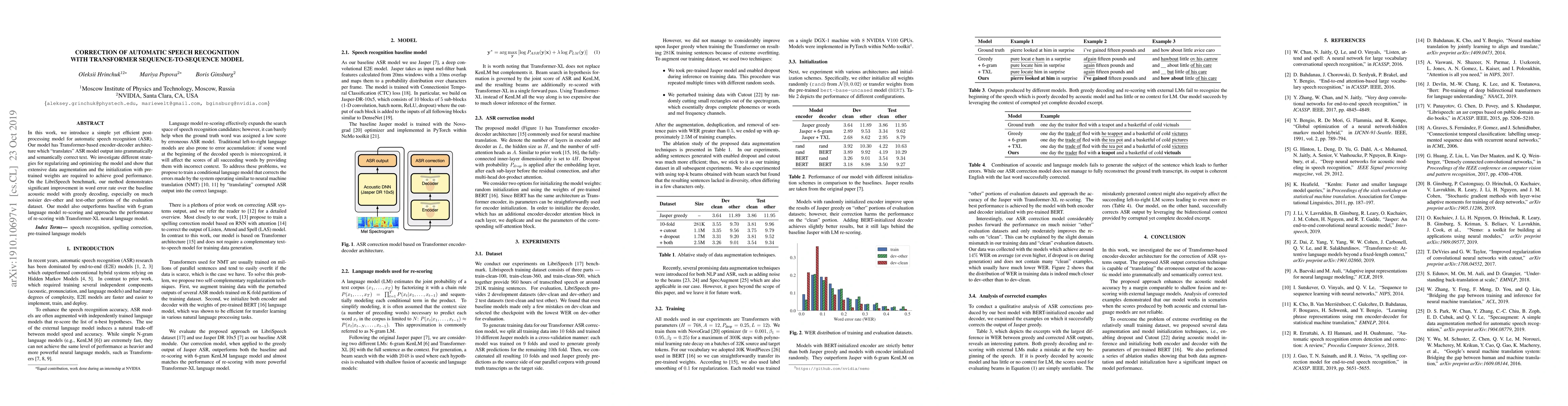 In this work, we introduce a simple yet efficient post-processing model for automatic speech recognition (ASR). Our model has Transformer-based encoder-decoder architecture which "translates" ASR model output into grammatically and semantically correct text. We investigate different strategies for regularizing and optimizing the model and show that extensive data augmentation and the initialization with pre-trained weights are required to achieve good performance. On the LibriSpeech benchmark, our method demonstrates significant improvement in word error rate over the baseline acoustic model with greedy decoding, especially on much noisier dev-other and test-other portions of the evaluation dataset. Our model also outperforms baseline with 6-gram language model re-scoring and approaches the performance of re-scoring with Transformer-XL neural language model.