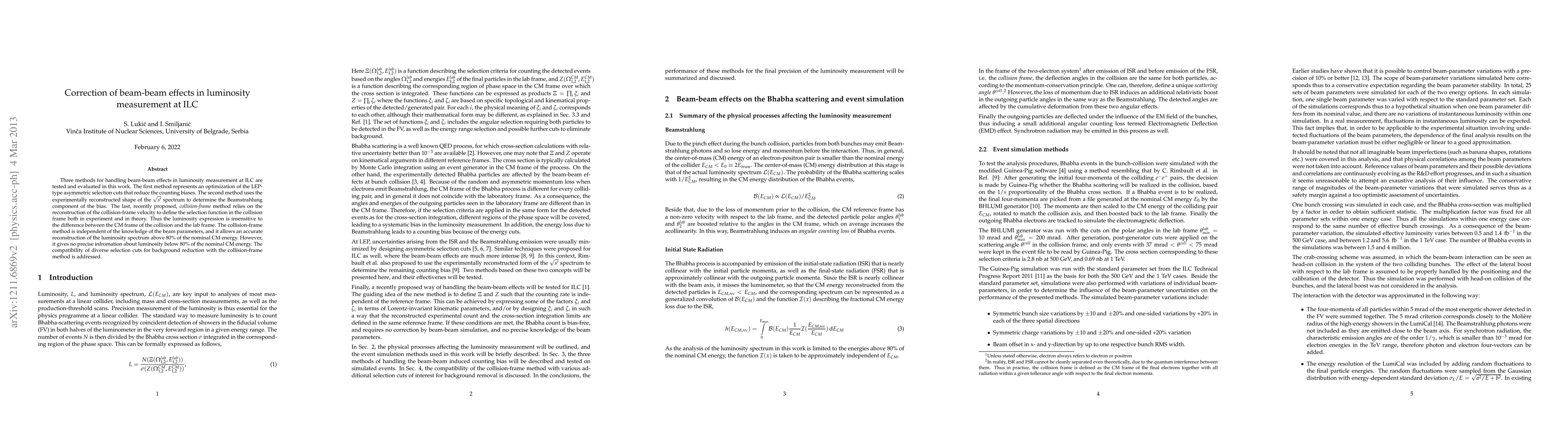 This paper evaluates three methods for correcting beam-beam effects in luminosity measurement at the International Linear Collider (ILC). The collision-frame method, which reconstructs the collision-frame velocity, offers accurate luminosity spectrum reconstruction above 80% of the nominal CM energy but lacks precision below this threshold.
