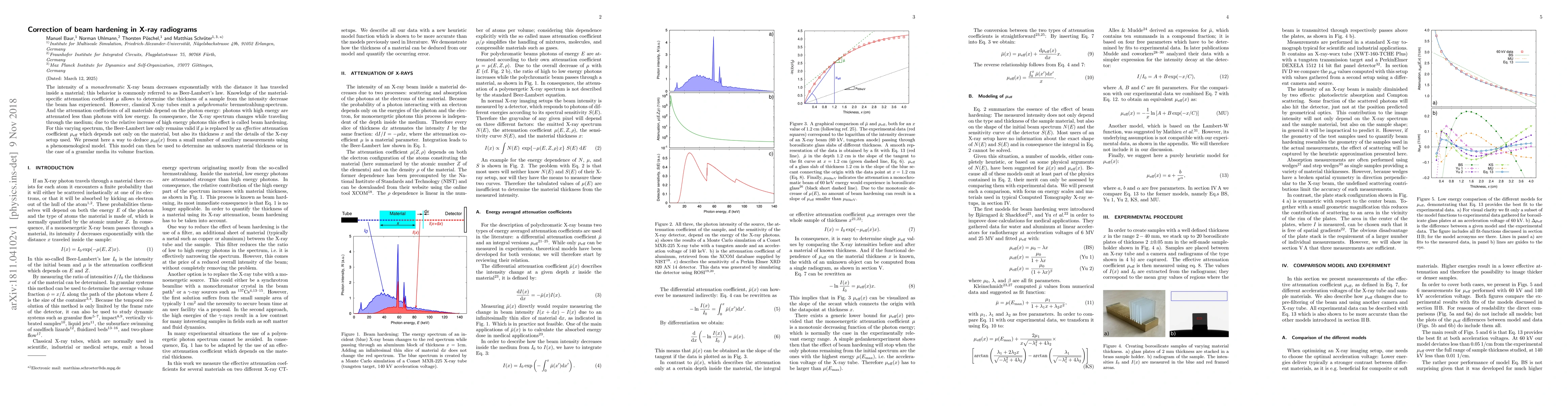 This research introduces a method to correct beam hardening in X-ray radiograms, a phenomenon causing spectrum changes due to varying photon energies. The technique deduces an effective attenuation coefficient from few auxiliary measurements, enabling thickness or volume fraction determination in materials.