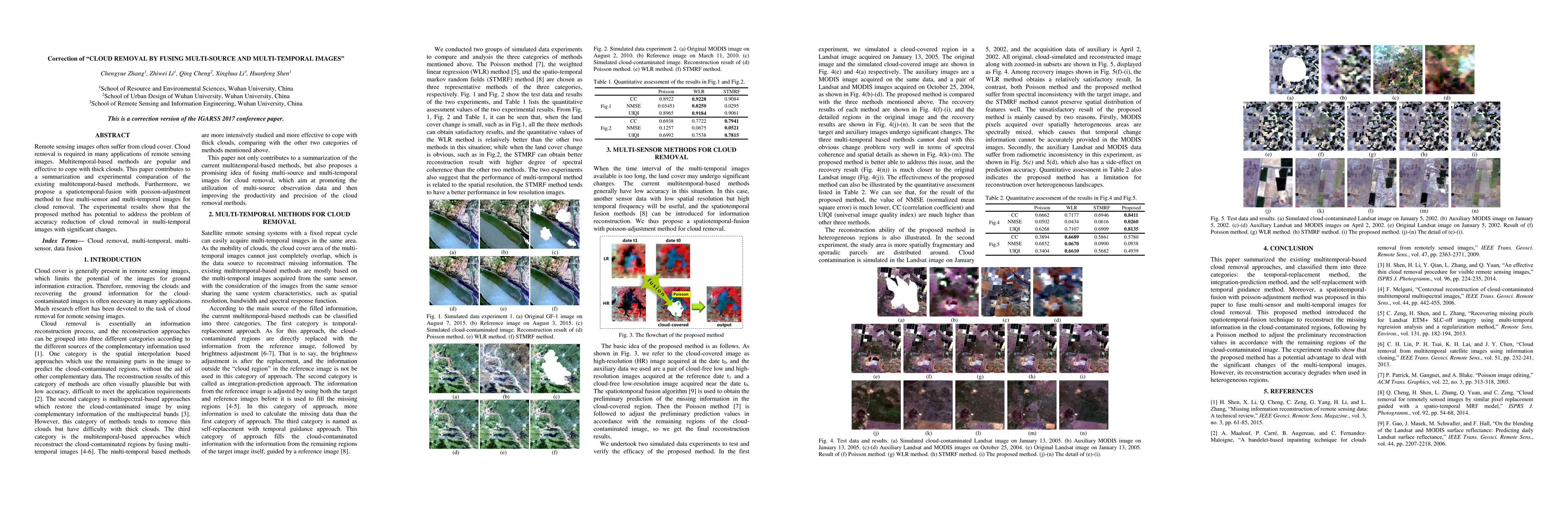 This paper reviews existing multitemporal-based methods for cloud removal in remote sensing images and proposes a new spatiotemporal-fusion with Poisson-adjustment technique. Experimental results indicate the new method effectively addresses accuracy reduction issues in cloud removal for images with significant temporal changes.