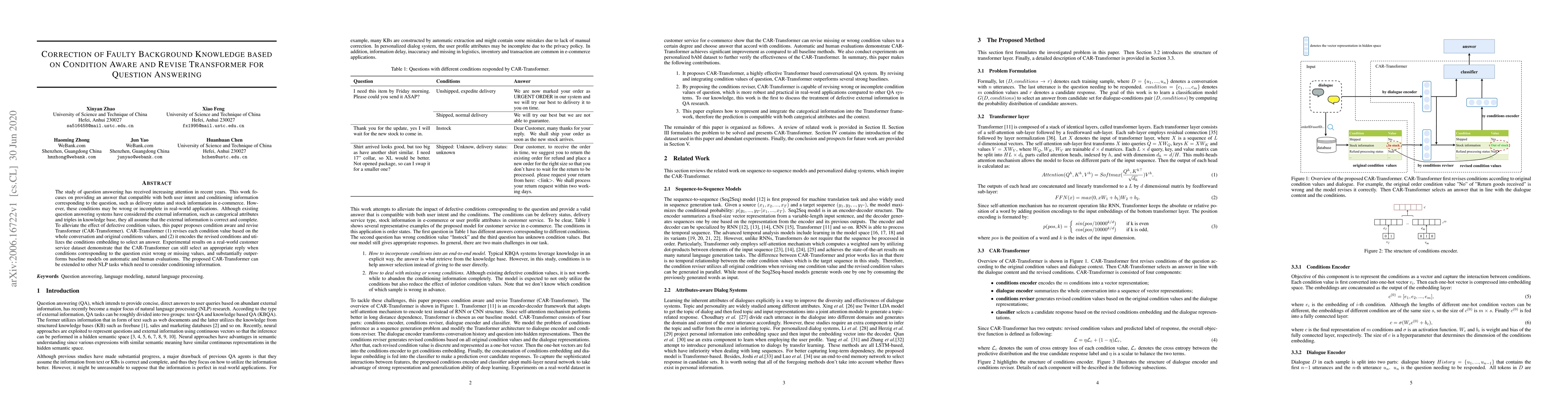 This paper introduces the Condition Aware and Revise Transformer (CAR-Transformer) to correct faulty background knowledge in question answering systems, especially in e-commerce contexts. CAR-Transformer revises condition values based on conversation context and selects answers using condition embeddings, outperforming baselines in both automatic and human evaluations.