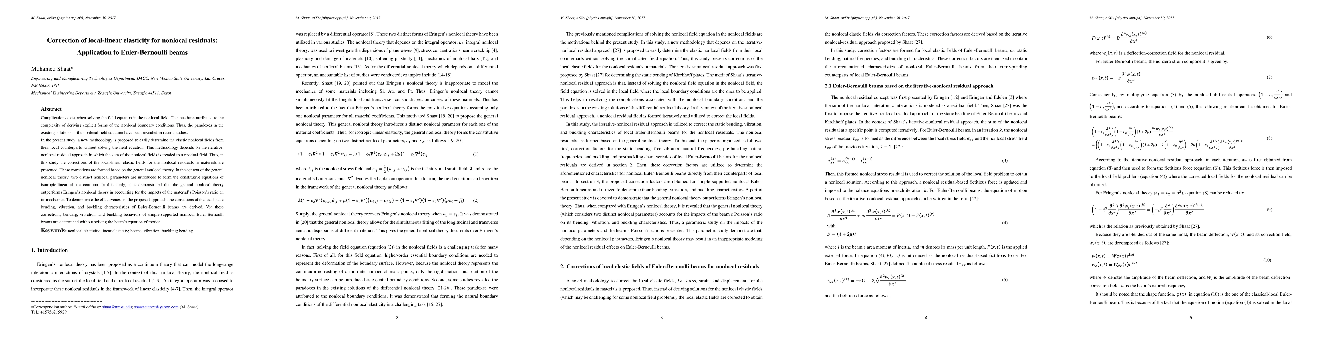 This paper proposes a new methodology to correct local-linear elasticity for nonlocal residuals using the iterative-nonlocal residual approach, demonstrating its effectiveness in determining the static bending, vibration, and buckling characteristics of Euler-Bernoulli beams without solving the beam equation of motion. The general nonlocal theory is shown to outperform Eringen-nonlocal theory in accounting for material Poisson ratio effects.