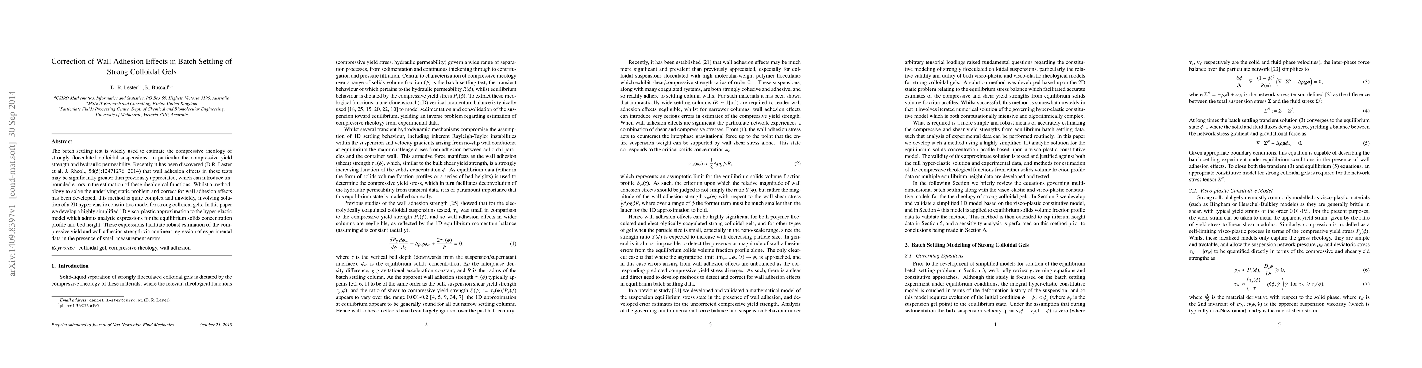 This paper proposes a simplified 1D visco-plastic model to correct for wall adhesion effects in batch settling tests of strongly flocculated colloidal suspensions, providing analytic expressions for solids concentration and bed height to estimate compressive yield strength and hydraulic permeability accurately. The method facilitates robust estimation through nonlinear regression of experimental data.